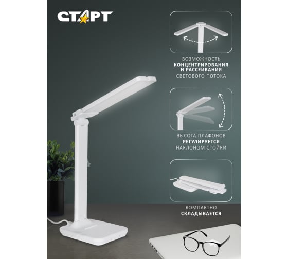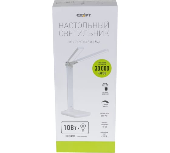 Модель СТАРТ СТ90 имеет 3 уровня яркости. Сенсорный переключатель яркости находится на подставке. Светильник работает от сети со стандартным напряжением 220 В, подключается с помощью вилки и шнура.