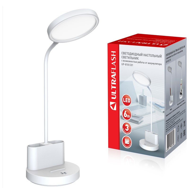 Светильник светодиодный настольный Ultraflash UF-818 с подставкой для письменных принадлежностей и телефона предназначен для освещения индивидуального рабочего пространства. Наличие аккумулятора обеспечивает мобильность светильника, а гибкая стойка позволяет регулировать угол наклона.