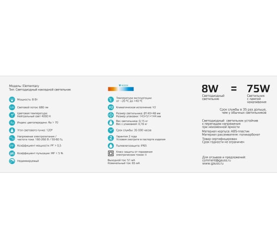 Технические характеристики Gauss круглый IP65 8W 4000K 126411208