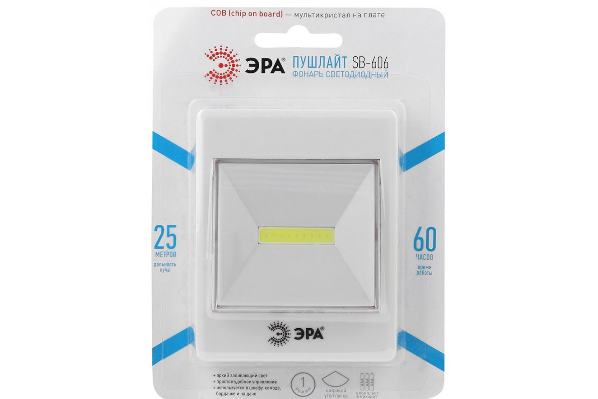 Фонарь-пушлайт ЭРА SB-606 идеален для подсветки полок шкафов и ящиков комодов, для дополнительной подсветки кухонных рабочих поверхностей, для освещения подсобок. Устройство экономично - от одного комплекта батареек (3хААА) работает свыше 60 активных часов.