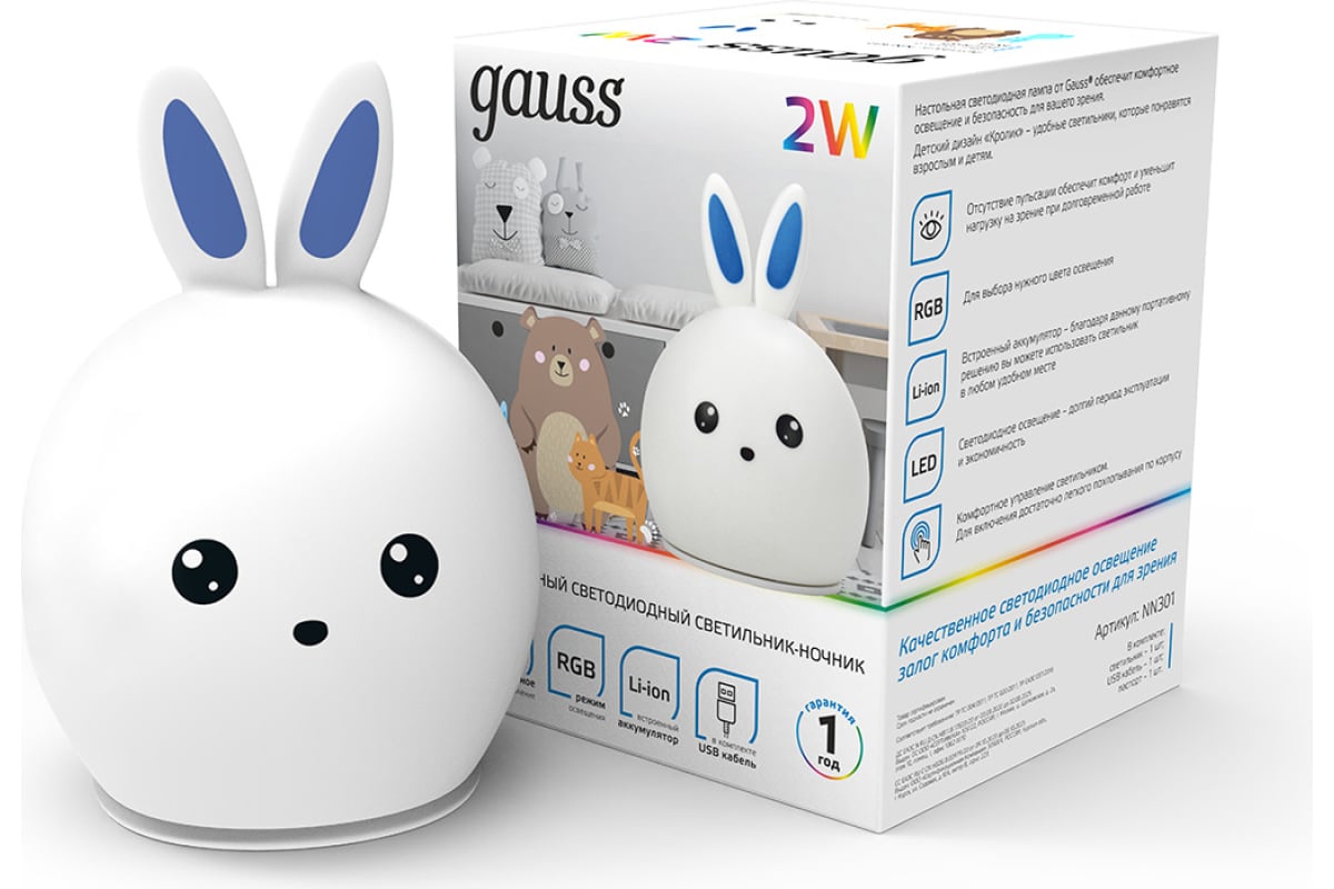 Настольный светодиодный детский ночник Gauss 2w rgb, li-ion, usb кабель, кролик NN301 выполнен из мягкого и безопасного материала. Оснащен Li-ion аккумулятором, что позволяет с легкостью переносить и использовать его в удобном для ребенка месте в течение длительного времени. Зарядка аккумулятора осуществляется от шнура с USB разъемом идущего в комплекте.