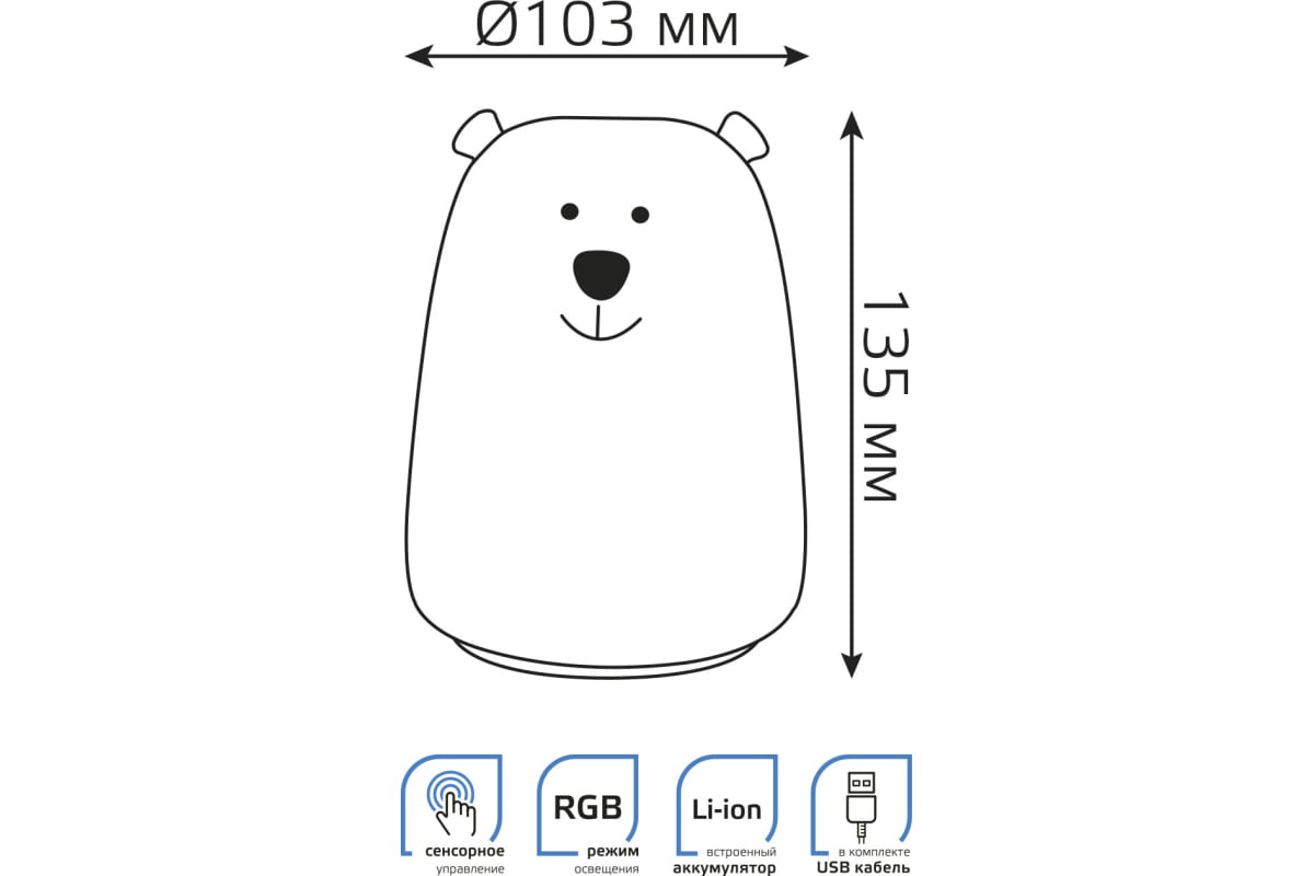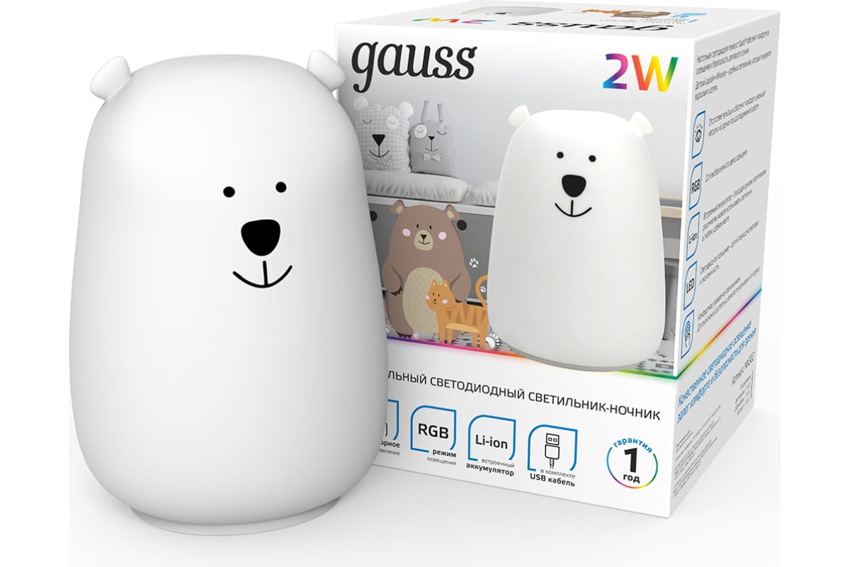 Настольный светодиодный детский ночник Gauss 2w rgb, li-ion, usb кабель, медведь NN302 выполнен из мягкого и безопасного материала. Оснащен Li-ion аккумулятором, что позволяет с легкостью переносить и использовать его в удобном для ребенка месте в течение длительного времени. Зарядка аккумулятора осуществляется от шнура с USB разъемом идущего в комплекте.