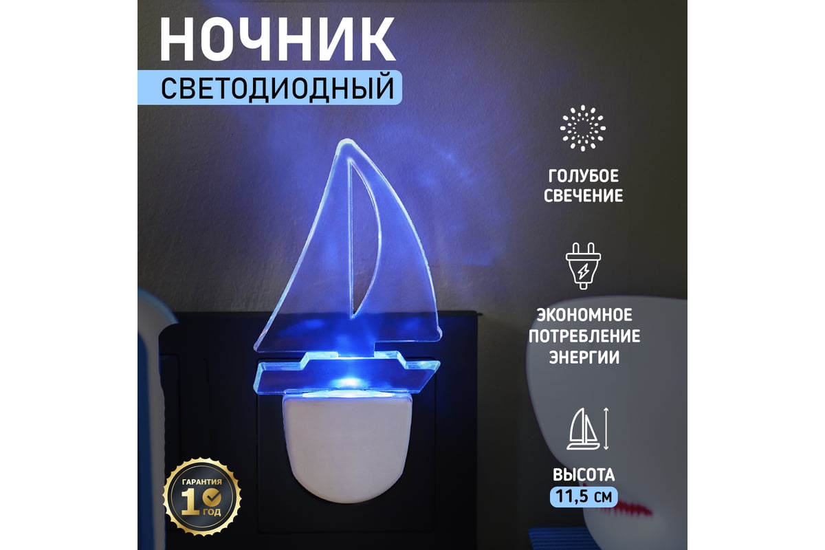 Светодиодный ночник REXANT ПАРУС ОДИНОКИЙ голубое свечение 75-0313 предназначен для освещения бытовых помещений, коридоров, спален и санузлов в темное время суток.