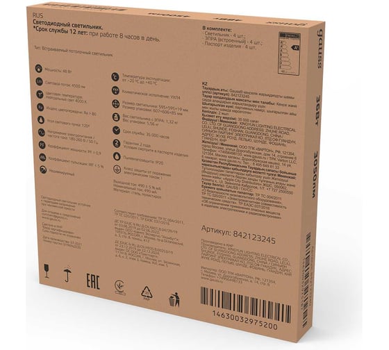 Технические характеристики Gauss 595x595x19мм 45W 4100lm 4000K призм. рассеиватель 842123245