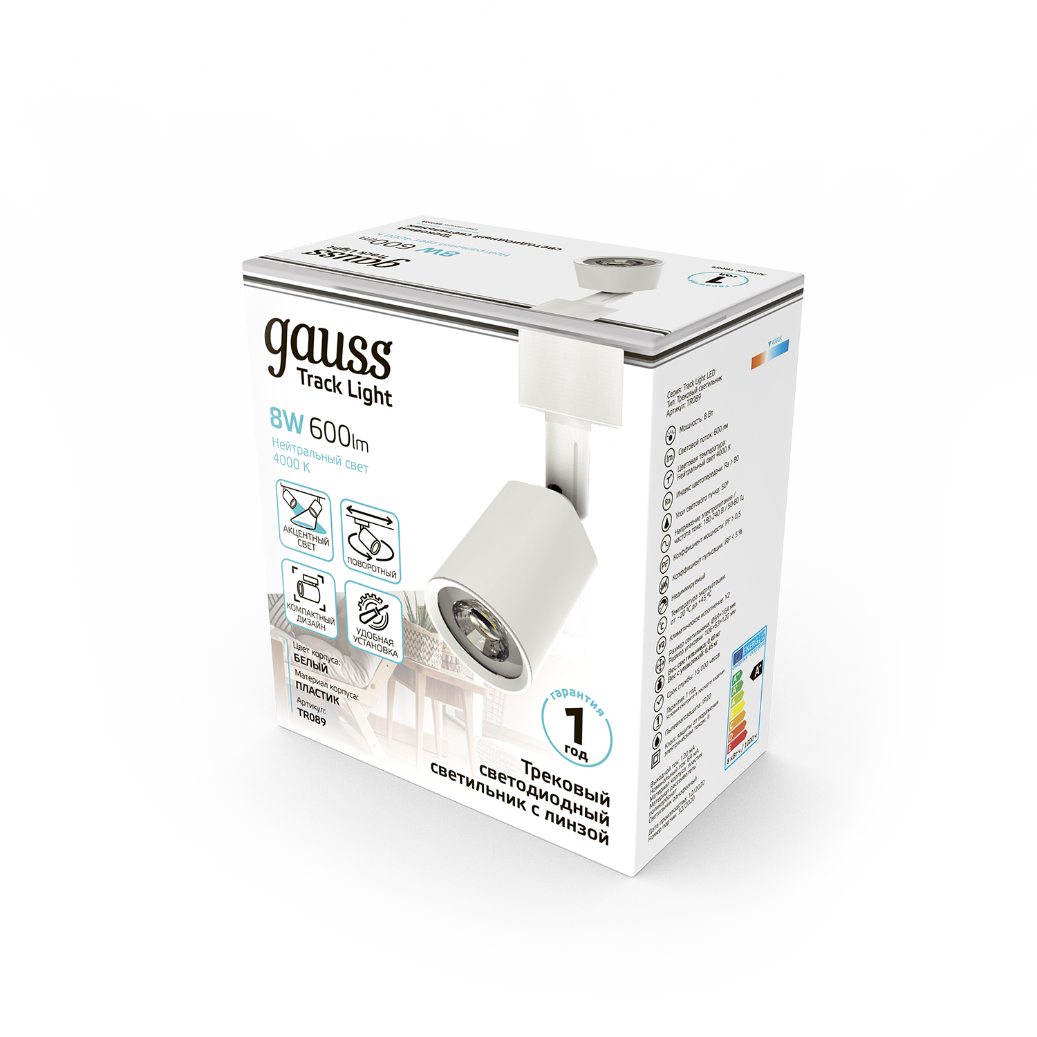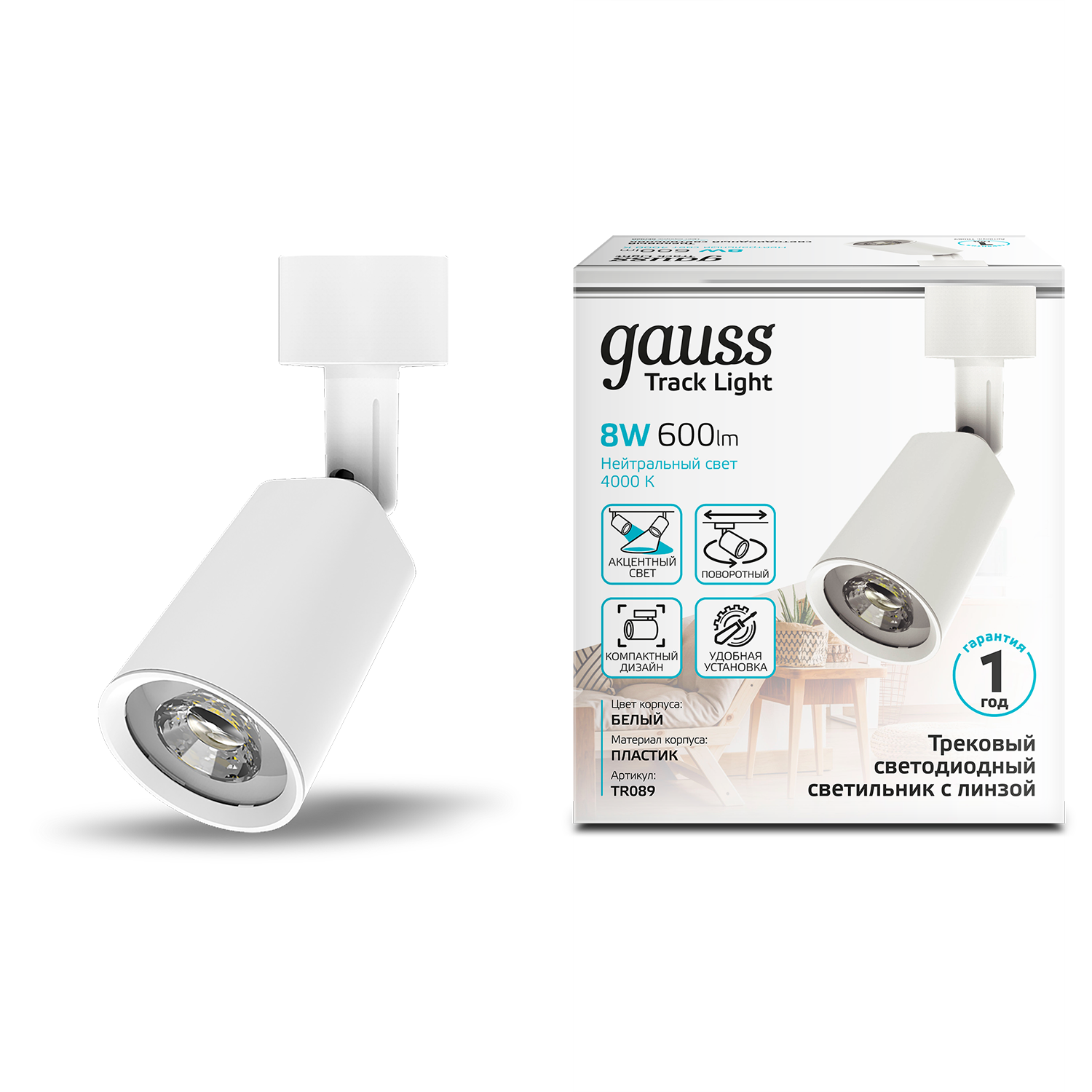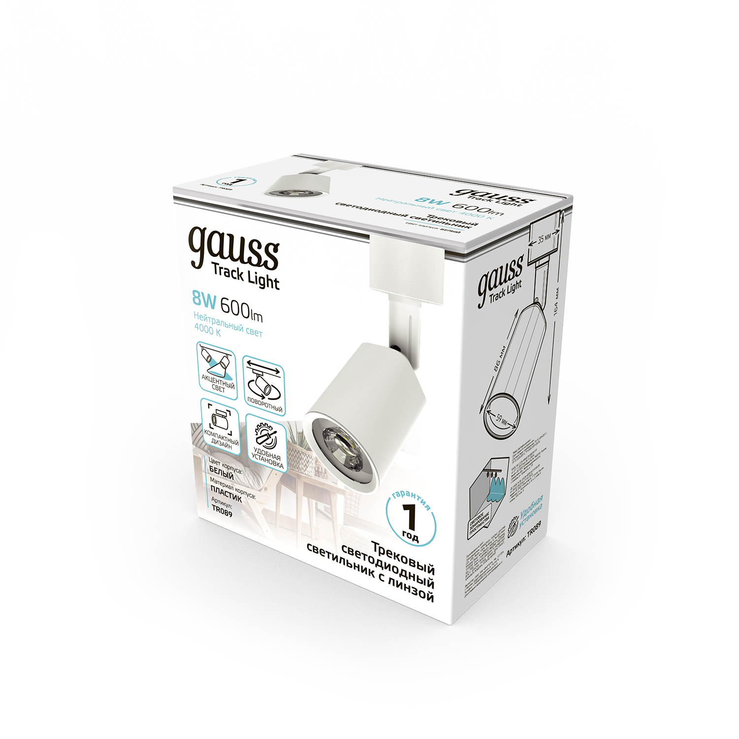 Светильник трековый Gauss цилиндр 8W TR089 с максимальным углом светового пучка 50° и белым нейтральным светом 4000К подойдет для освещения жилых комнат и коммерческих помещений. Может располагаться на потолочных и/или стеновых шинопроводах дополняя историю освещения над рабочей зоной письменного стола, подчеркивая объем и содержимое функциональных и декоративных ниш или освещая картины, декор мебели и стен, интерьерные цветы. Может использоваться один спот или в комплексе с другими светильниками в системе трекового освещения Gauss.