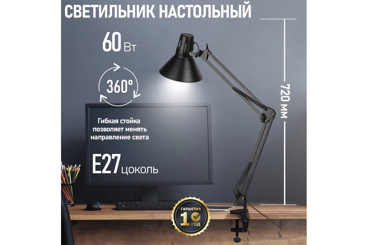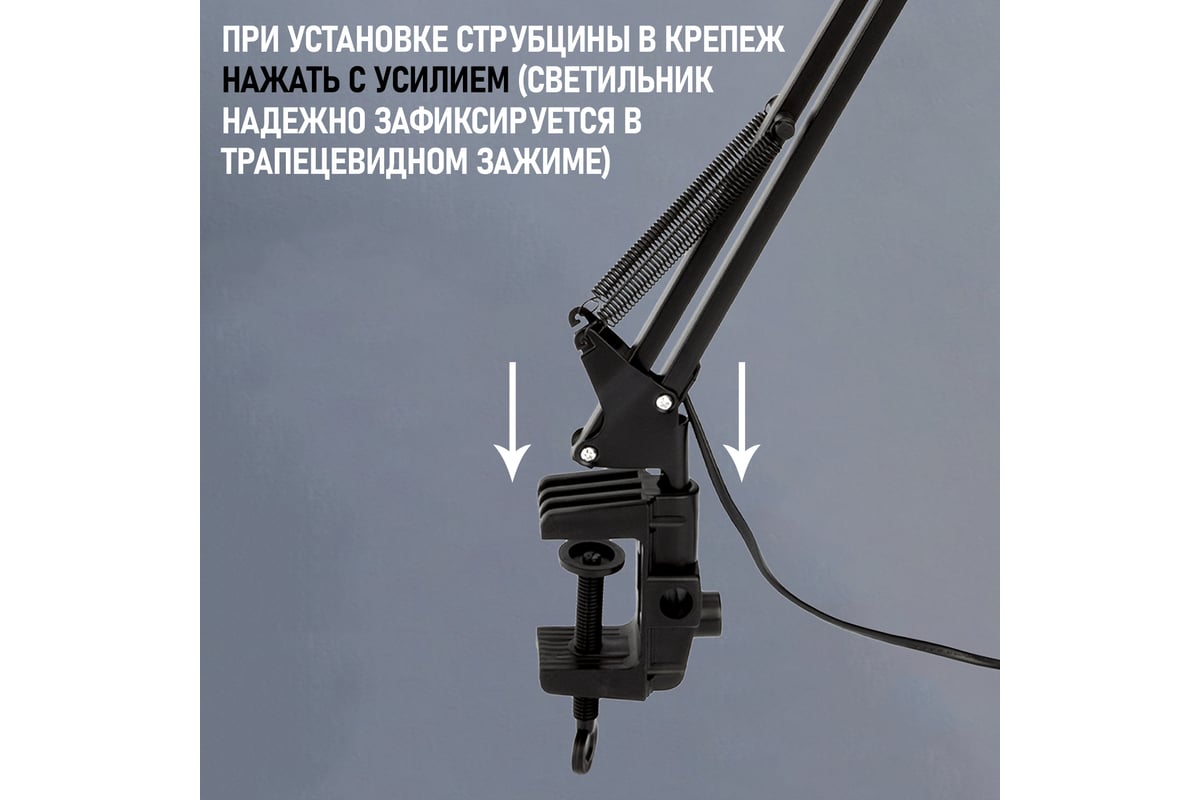 Винтовой зажим позволяет прочно фиксировать светильник как на стол, так и на спинку кровати и на прочие предметы мебели, а гибкая стойка позволяет менять направление света на 360°. Класс электробезопасности: II. Длина шнура: 1 м.