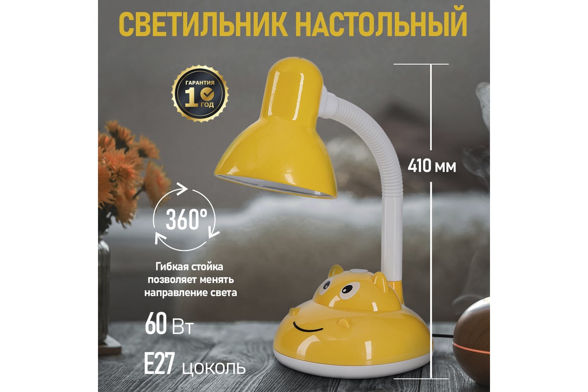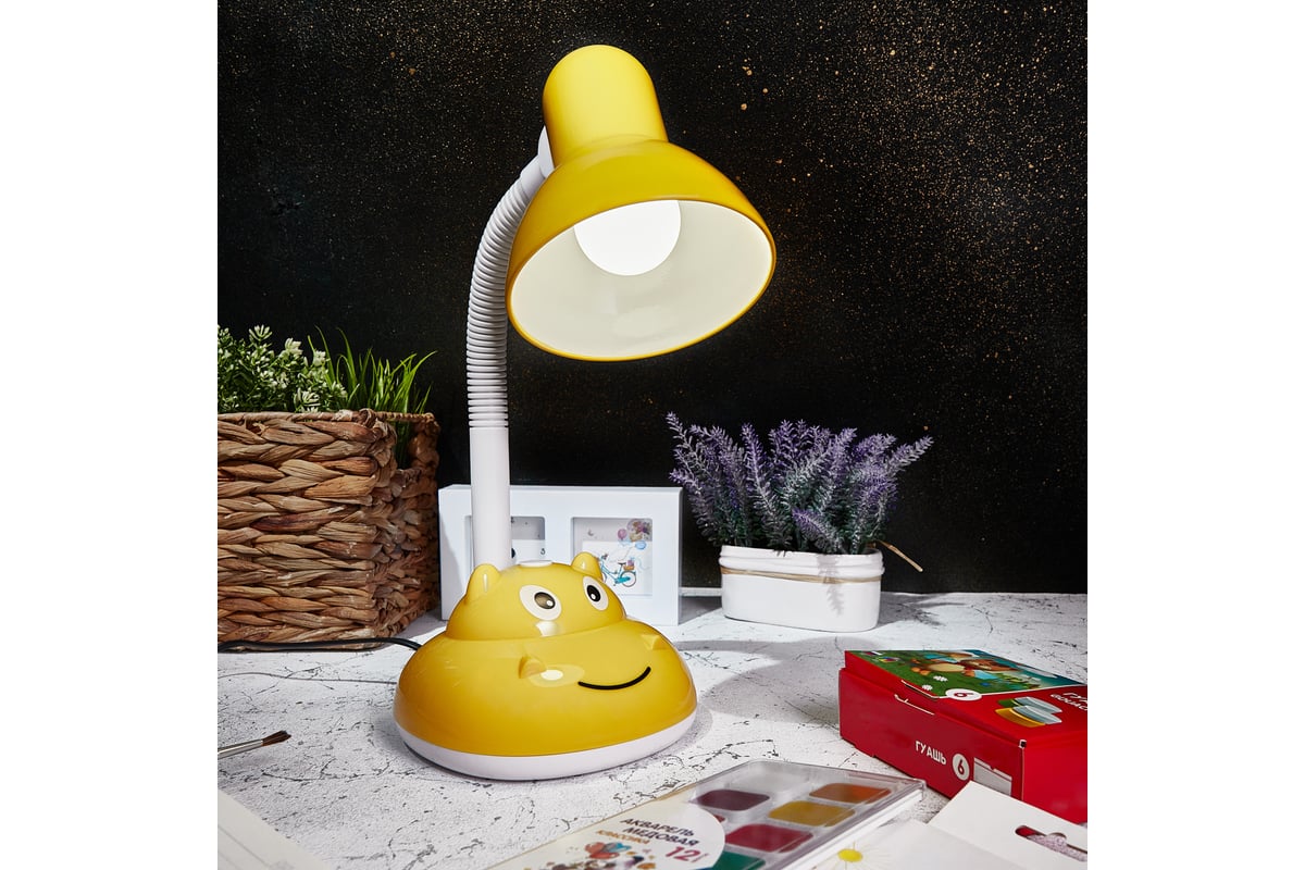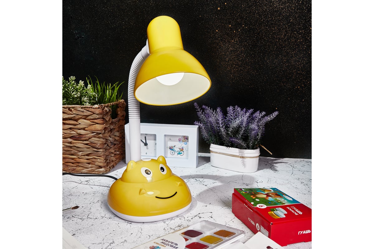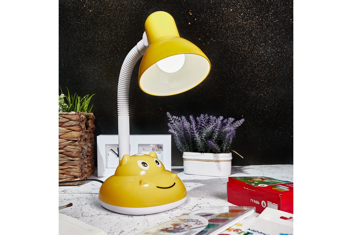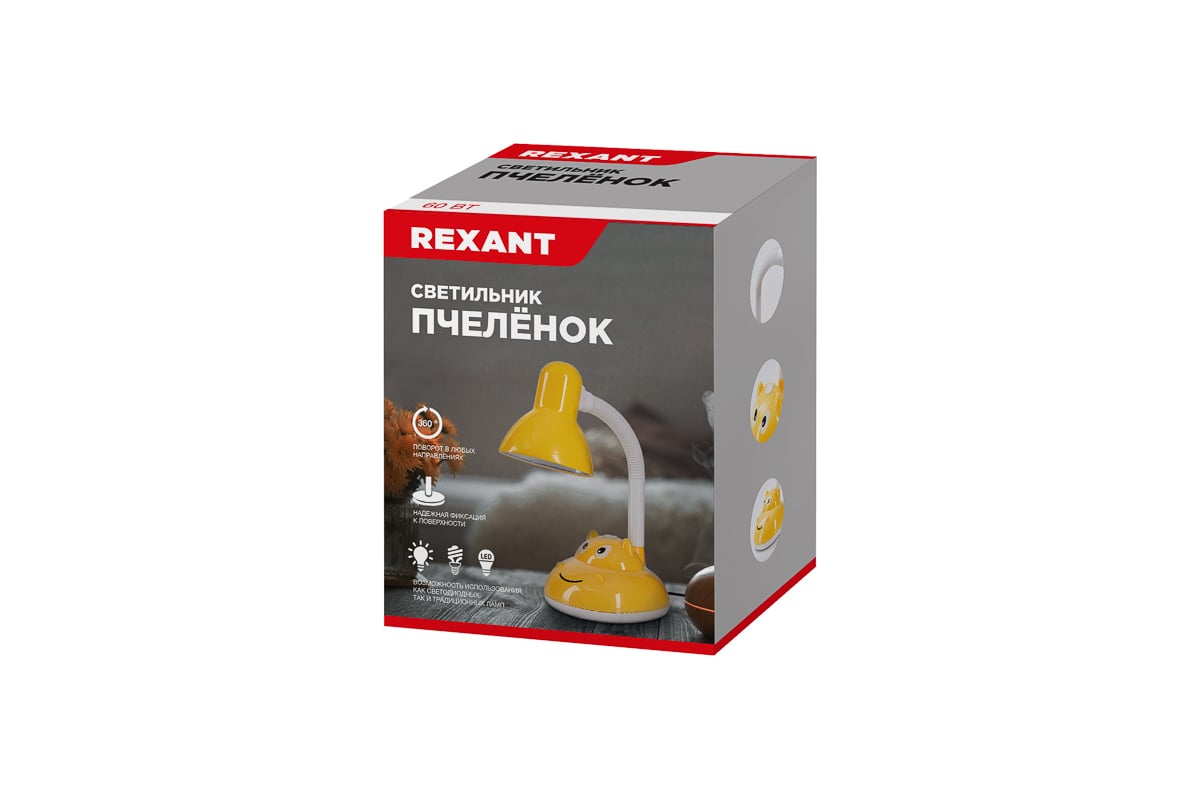 Настольная лампа REXANT Пчеленок Е27 желтая 603-1014 используется для освещения рабочего места, места чтения или учебы. Гибкая стойка позволяет менять направление света на 360°. Удобный выключатель расположен на устойчивом основании. Класс электробезопасности: II. Длина шнура: 1 м.