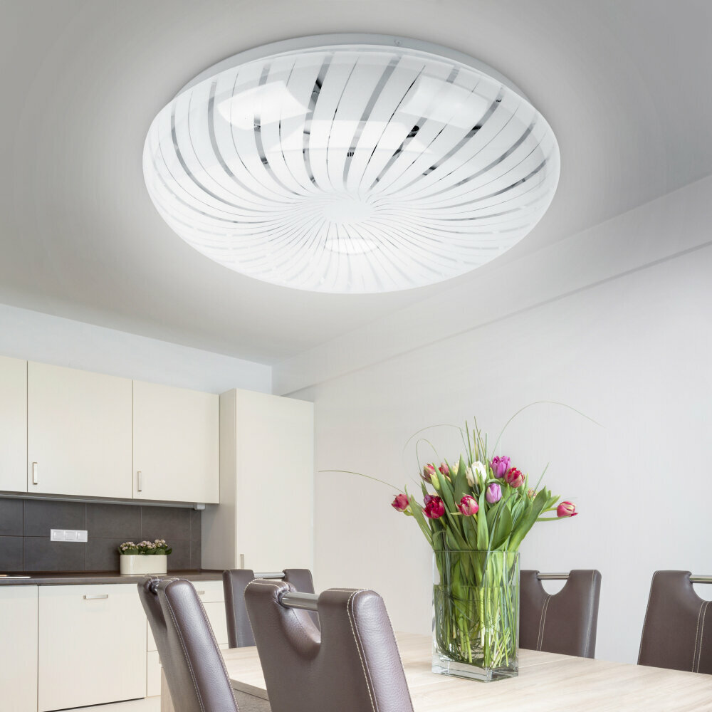 Несомненным преимуществом электросветильника является алюминиевое основание. Благодаря отличному теплоотводу обеспечивается продолжительный срок службы. Плафон с узором-медузой идеально сочетается с выпуклым круглым корпусом. Эксклюзивный дизайн позволяет увеличить количество вариантов использования LED люстры. Изящное потолочное освещение получится обустроить в гостиной, прихожей или спальне.