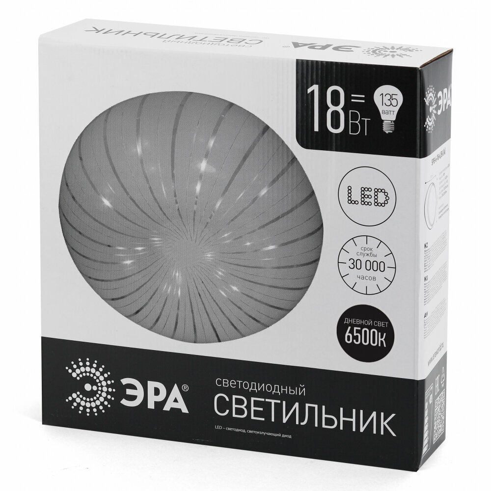 Потолочный светодиодный светильник ЭРА SPB-6-18-6,5K Meduza 18Вт 6500K, Б0054062 благодаря плафону из матового пластика обеспечивается равномерное распределение света. В совокупности с цветовой температурой в 6500 К создается приятное белое свечение, защищающее глаза. Несомненным преимуществом электросветильника является алюминиевое основание.