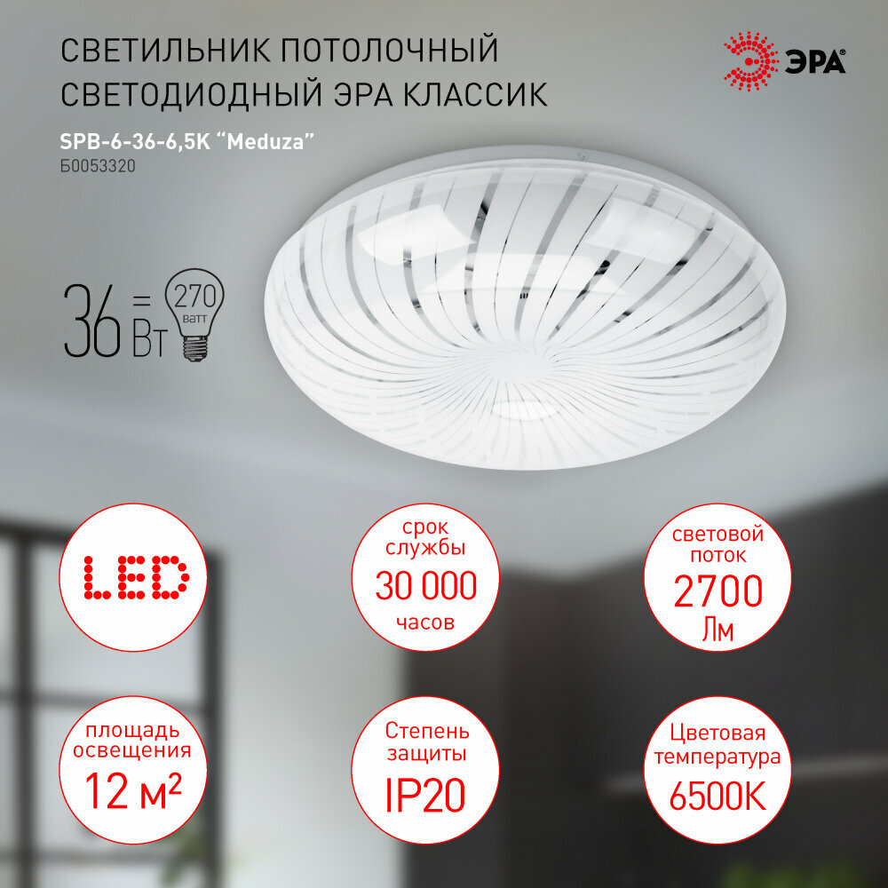 Потолочный светодиодный светильник ЭРА SPB-6-36-6,5K Meduza 6500К 1850лм, Б0053320 с плафоном из матового пластика, обеспечивающего равномерное распределение света. В совокупности с цветовой температурой в 6500 К создается приятное белое свечение, защищающее глаза.