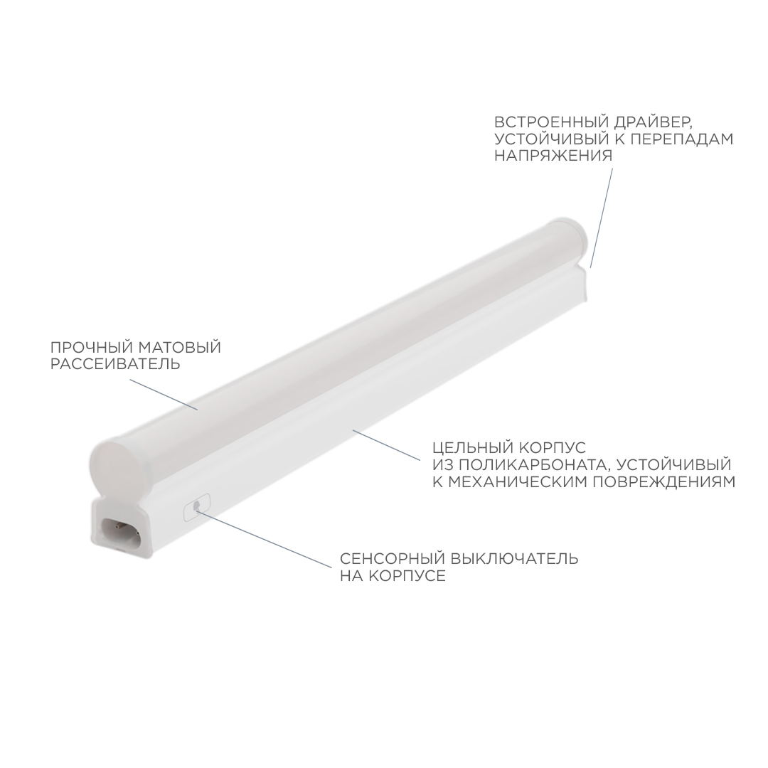 Сенсорный светодиодный светильник Т5 30-01 управляется одним касанием благодаря сенсорному выключателю. Излучает световой поток в 420 Лм, потребляя при этом 4 Вт, что является эквивалентом лампы накаливания 40 Вт. В светильнике используются светодиоды с дневным белым цветом свечения и цветовой температурой 4000 К, которая наиболее близка к естественному солнечному свету. Корпус и рассеиватель светильника сохранят свой первозданный вид и светорассеивающие качества на протяжении всего срока эксплуатации благодаря тому, что изготовлены из поликарбоната, который устойчив к воздействию температур и солнечного света. Размер светильника 305х23х35мм. Степень защиты светильника от пыли и влаги соответствует стандарту IP20, что подразумевает эксплуатацию в сухих, проветриваемых помещениях. В комплекте: сетевой шнур длиной 950 мм, коннектор для гибкого соединения длиной 150 мм и коннектор для жесткого соединения светильников, торцевая заглушка, крепежные элементы для фиксации в накладном варианте. Количество светильников, которые можно соединить последовательно, 14 шт. Благодаря надежному драйверу светодиоды защищены от скачков напряжения, а сам светильник сохраняет равномерное свечение. Работает от сети с напряжением 230 В.