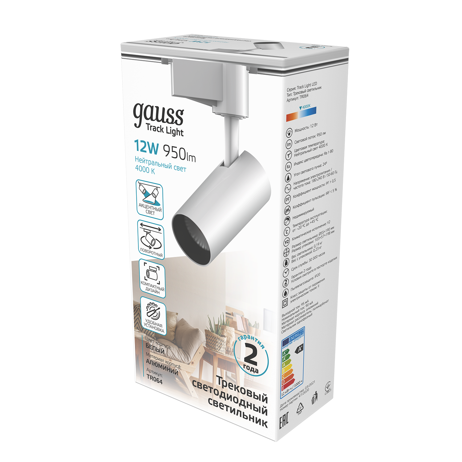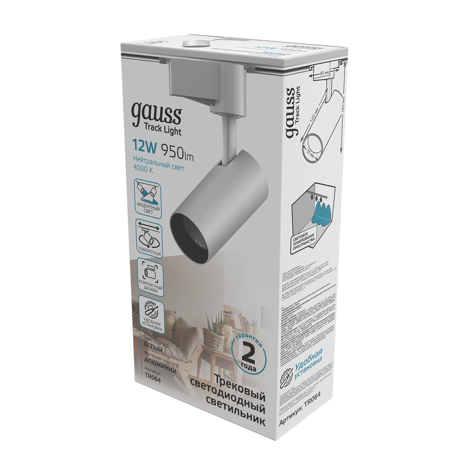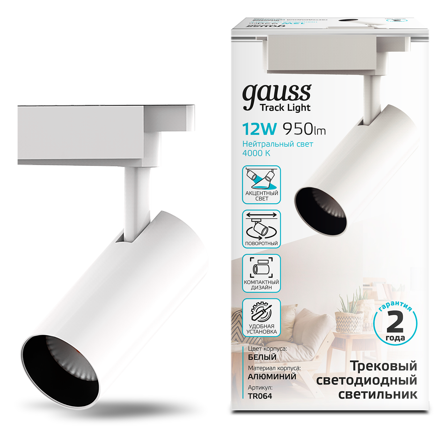 Светильник трековый Gauss цилиндр 12W TR064 это отличный осветительный прибор для создания уютного освещения зон гостинной, спальни, детской, гардеробной, коридора. Может применяться для подсветки витрин магазинов и барных стоек. Компактный дизайн и возможность направить свет в любую точку на стене, витрине или полу в сочетании с легким корпусом дают возможность монтировать светильник как на потолке, так и на любой высоте стены. Спот изготовлен из алюминиевого корпуса, зеркального отражателя и сатинированной линзы. Цвет белый. Встраивается в трековые системы Gauss. Имеет белый нейтральный свет 4000к.