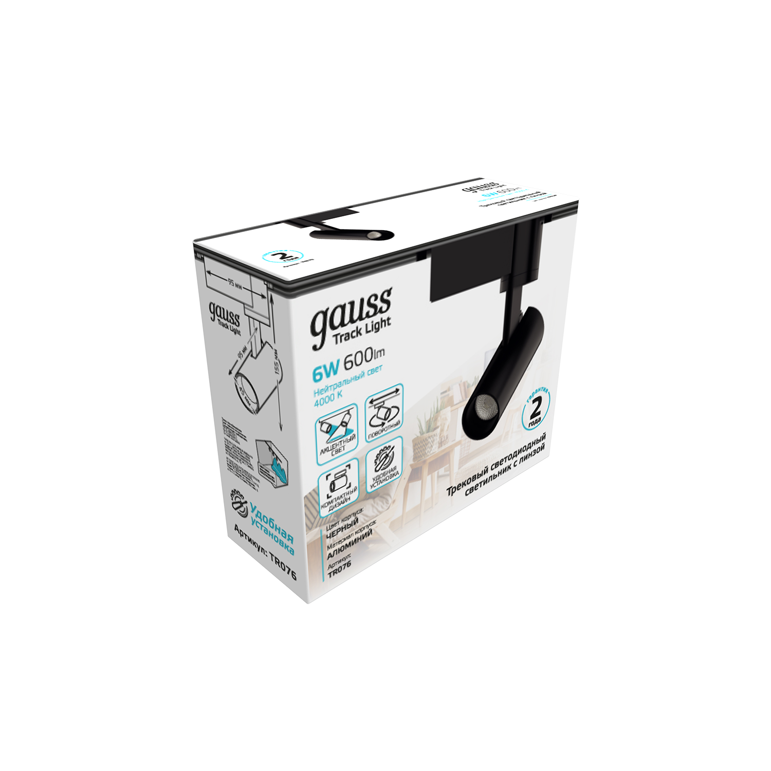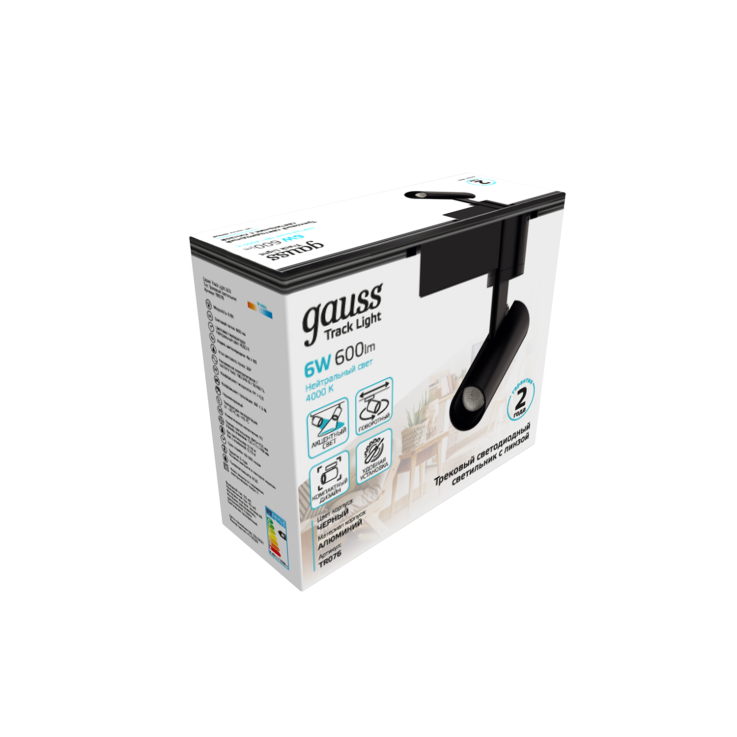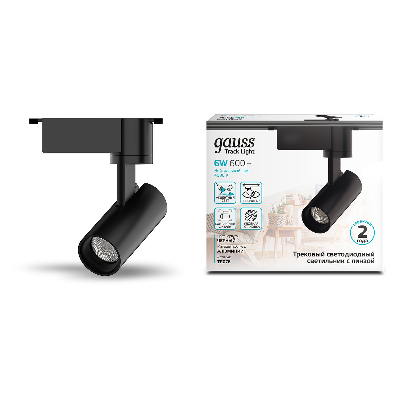 Светильник трековый Gauss цилиндр 6W TR076 это небольшой черный спот, с нейтральным белым светом 4000К и углом светового пучка 36°, который может выступать в роли индивидуальной акцентной подсветки деталей и предметов интерьера. В комплексе с другими спотами на трек системах Gauss будет освещать все пространство комнаты. Мобильность на шинопроводе и возможность поворота в вертикальной и горизонтальной плоскостях позволяют часто и легко менять образ помещения, выделяя одни или другие объекты интерьера.