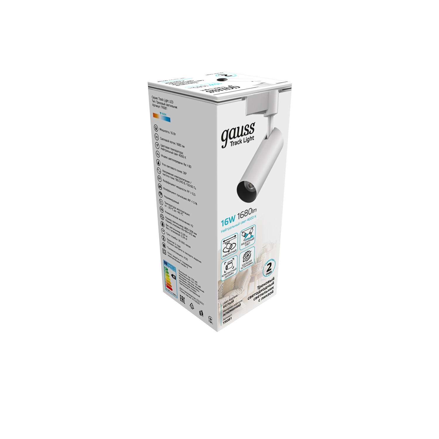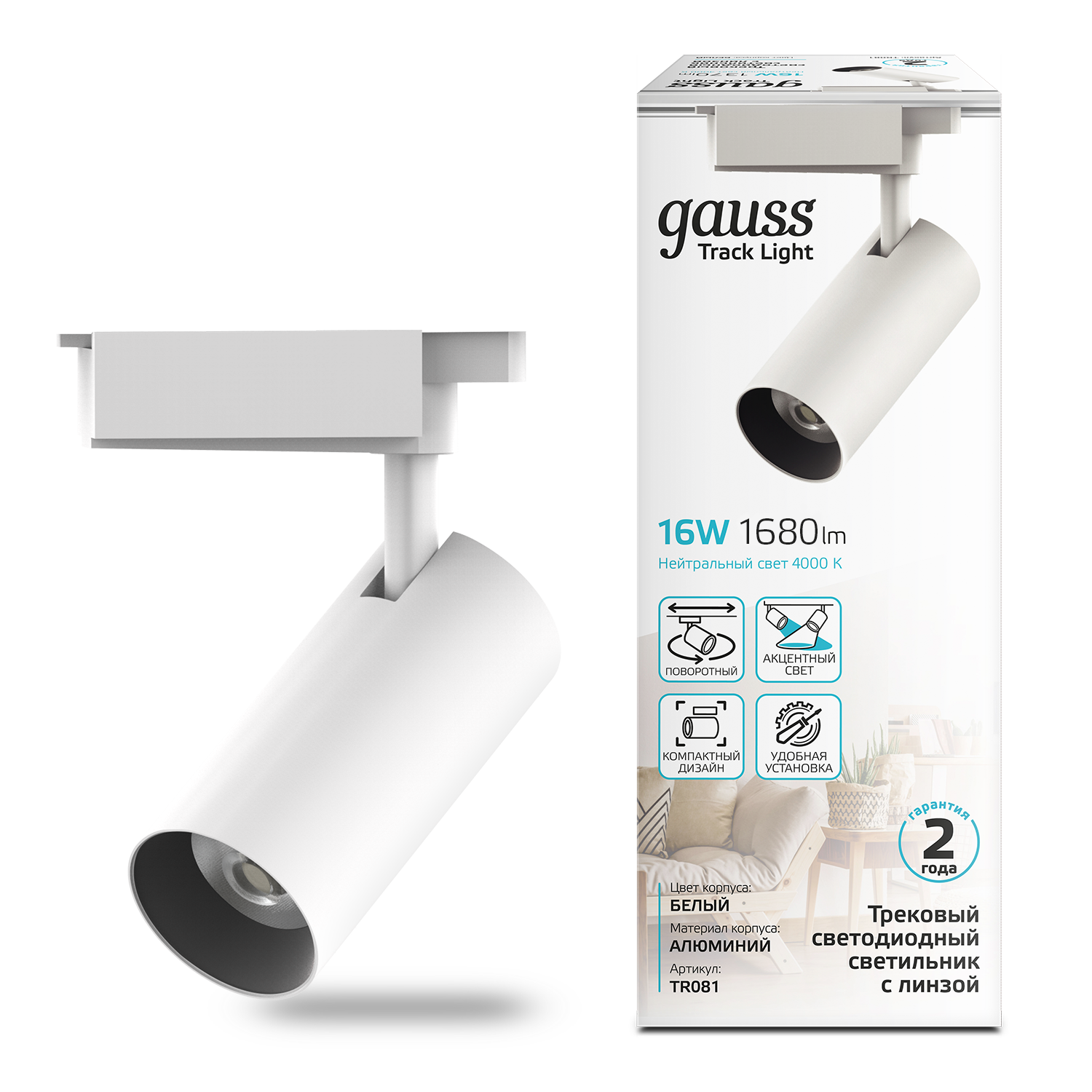 Светильник трековый Gauss цилиндр 16W TR081 совместим с трек-системой Gauss и может быть использован как отдельный элемент, так и в комплексе с другими спотами. Имеет широкие возможности регулировки в горизонтальных и вертикальных плоскостях. У него лаконичный дизайн, прочный компактный корпус из легкого алюминия. Угол светового пучка 36°, яркость потока 1680лм, свет белый нейтральный 4000 (не искажает цвета освещаемых предметов) Отлично работает в качестве интерьерного, акцентного освещения в жилых помещениях а так же в коммерческих для освещения витрин, барных стоек, примерочных.