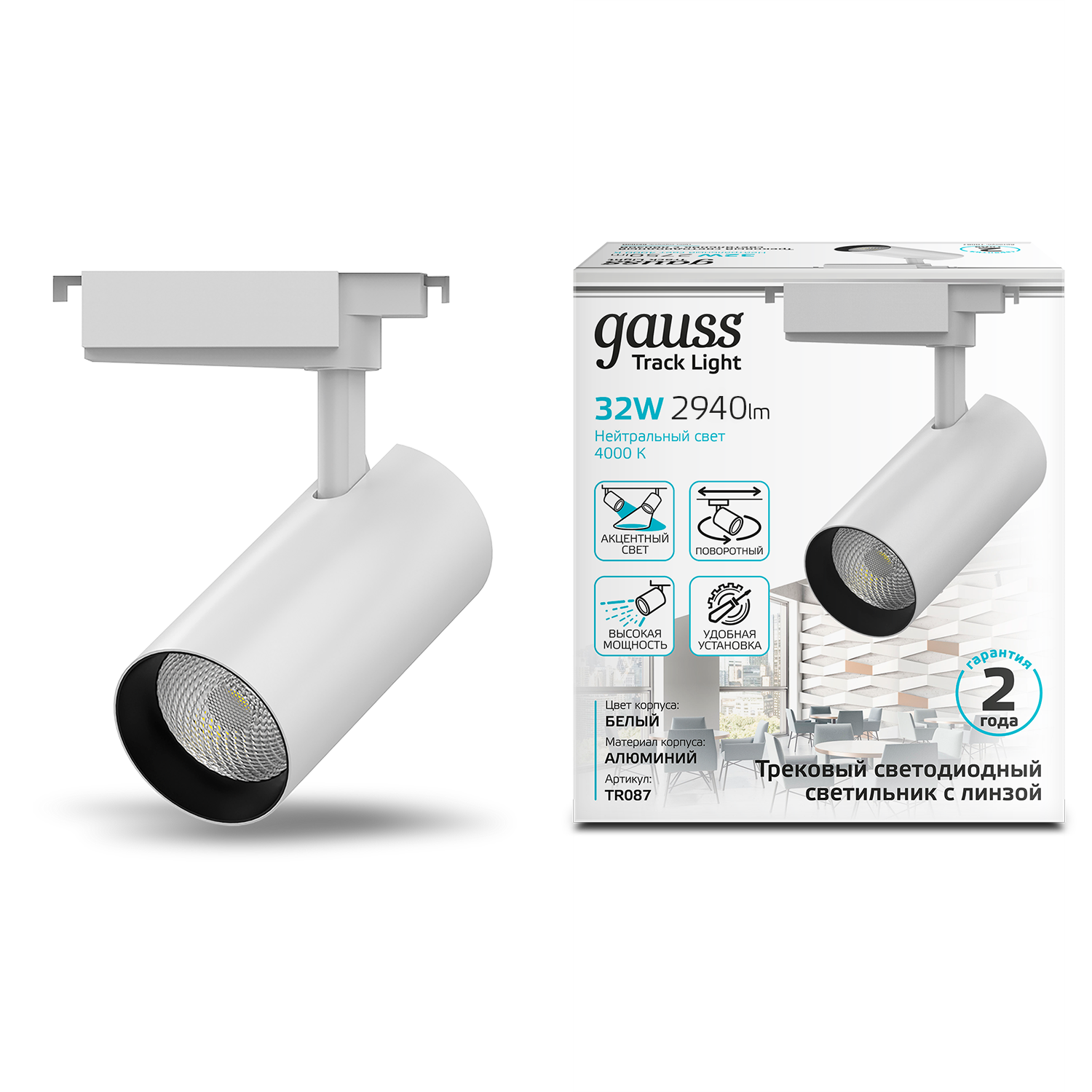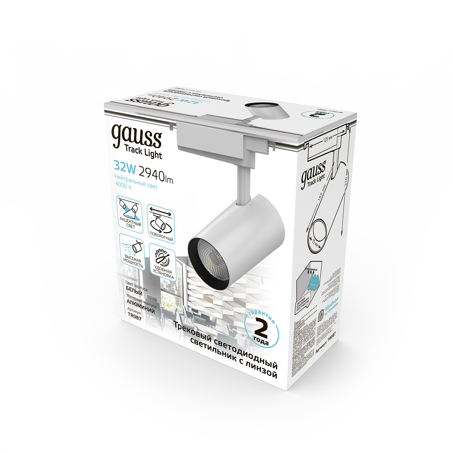 Светильник трековый Gauss цилиндр 32W TR087 один из самых мощных в линейке спотов Gauss формы цилиндр. При своем легком весе и совместимости с трек-системами Gauss он может выступать в качестве акцентного или основного света в разных световых историях. У него мощный LED световой поток 2940лм, угол концентрации светового пучка 36°, цветовая температура 4000К. Все это параметры позволяют использовать светильник в жилых комнатах и коммерческих помещениях.
