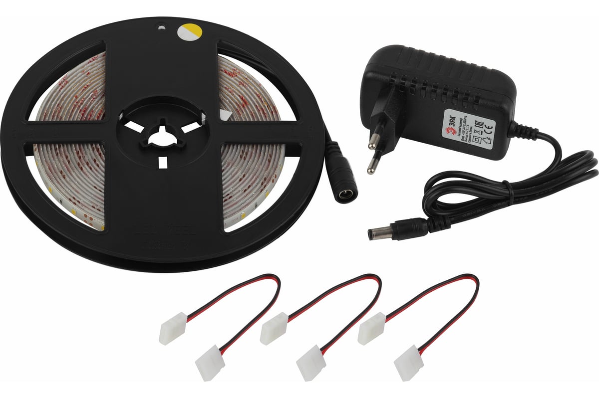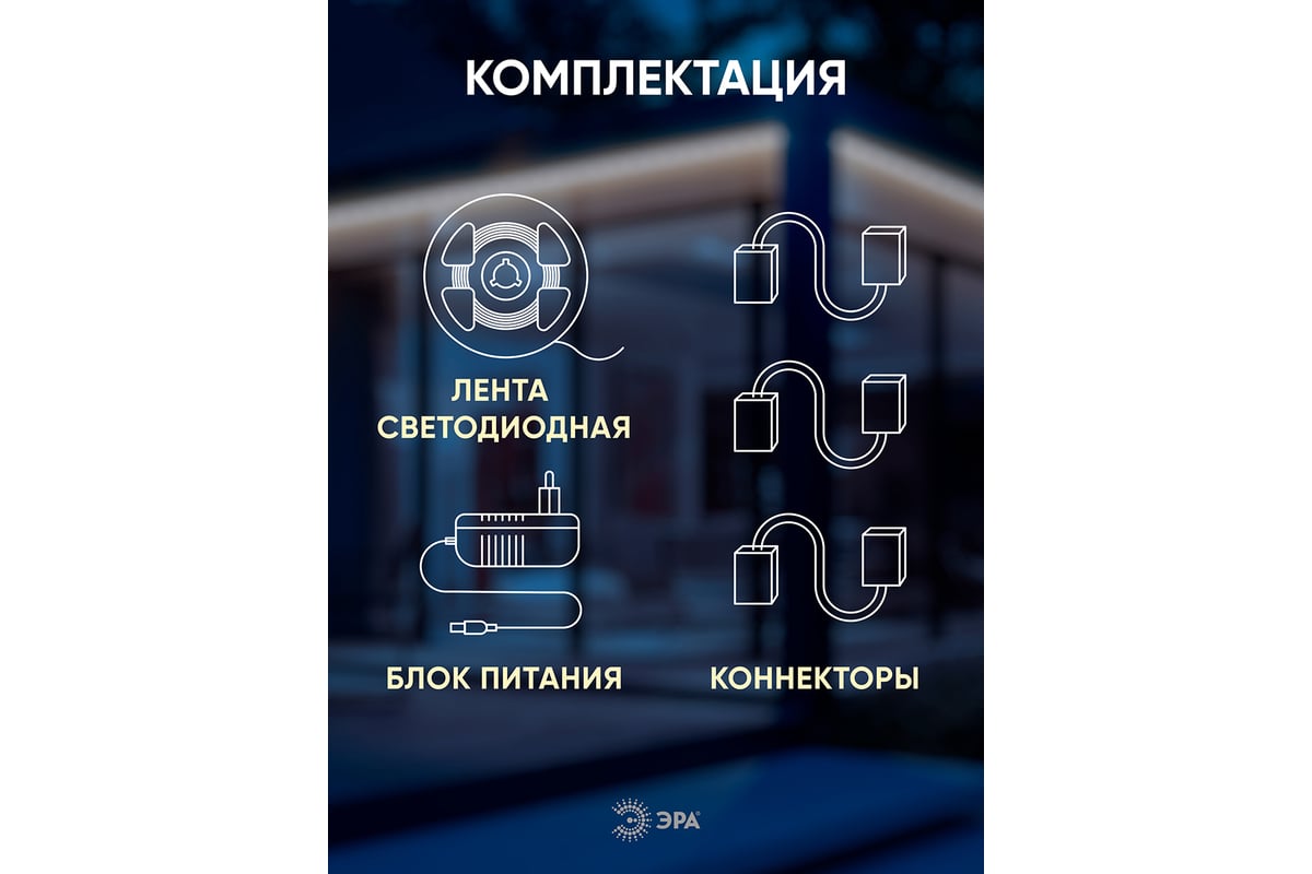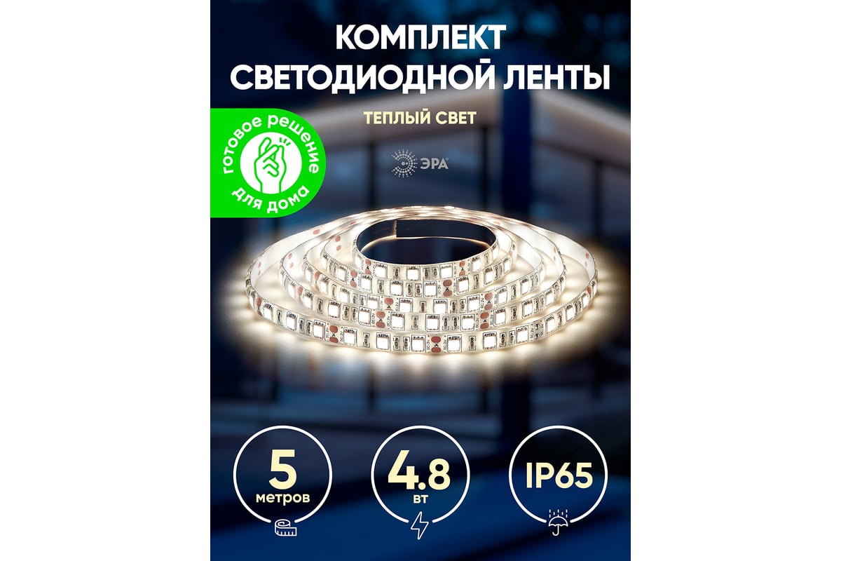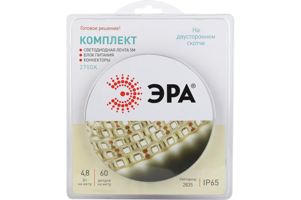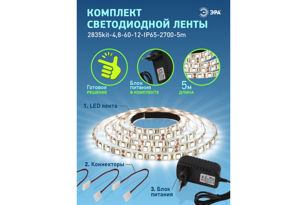 Комплект светодиодной ленты ЭРА 2835kit-4,8-60-12-IP65-2700-5m Б0043064 - это готовое решение для внутреннего освещения, подсветки ниш, лестничного пространства, систем хранения, декоративного и художественного оформления. В составе комплекта: LED лента на двустороннем скотче, источник питания, коннекторы.
