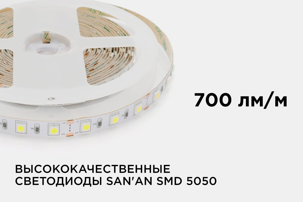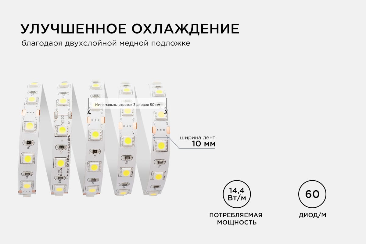 Светодиодная лента Apeyron 12В, 14.4 Вт/м 16 00-16 работает от постоянного тока с напряжением 12В. Благодаря светодиодам smd 5050 излучающим световой поток равный 700 лм/м лента является прекрасным решением для организации основного освещения и ярких декоративных подсветок. Она подойдет для создания основного освещения на базе многоуровневых потолков, а также будет отличным выбором для освещения торгового оборудования или требующих большой яркости рекламных вывесок. По сравнению с лампами накаливания светодиодная лента эквивалентна лампам мощностью 70 Вт.