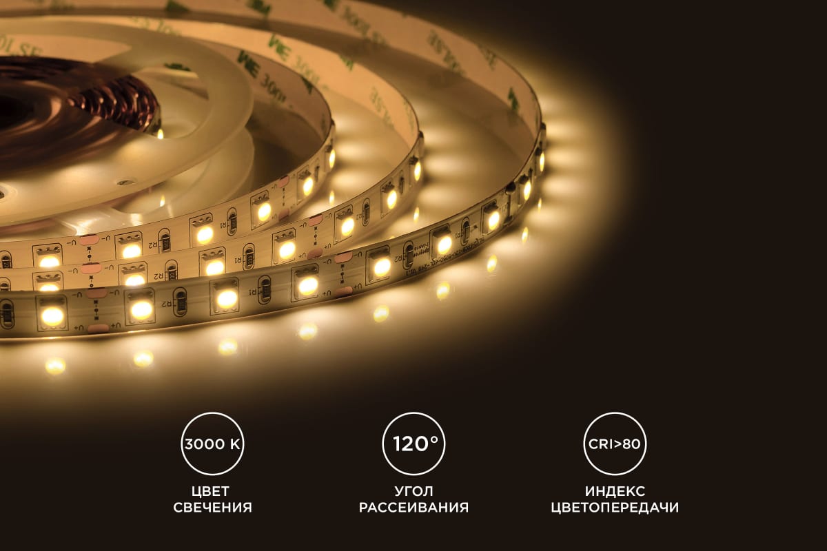 Данная модель светодиодной ленты обладает теплым белым цветом свечения с цветовой температурой 3000 К. При выборе светодиодной ленты важно учитывать такой параметр, как потребляемая мощность, чтобы правильно подобрать блок питания. У данной модели этот показатель равен 14,4 Вт на один метр. Степень защиты этого изделия соответствует стандарту IP20, что подразумевает использование только в сухих и проветриваемых помещениях. Отрезать светодиодную ленту можно в специально отмеченных местах, которые располагаются через каждые 50 мм. Компактные размеры светодиодной ленты с шириной 10 мм и основанием из гибкой, двухслойной, медной подложки дают огромное преимущество при создании любых дизайнерских фантазий.