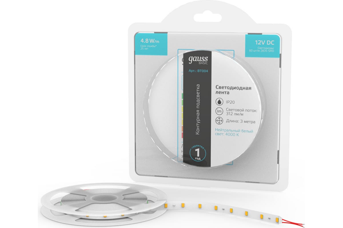 Лента Gauss Basic 12V 4,8W/m 312lm/m 4000K IP20 LED 3m BT004 способна решить ряд задач связанных как с декоративным освещением помещений, так и с экстерьерной подсветкой.