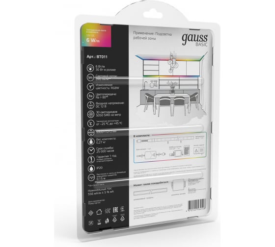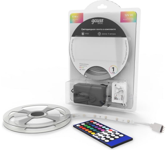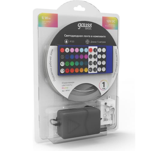 Лента Gauss Basic в комплекте 12V 6W/m 390lm/m RGBW IP20 LED 5m BT011 способна решить ряд задач связанных как с декоративным освещением помещений, так и с экстерьерной подсветкой.