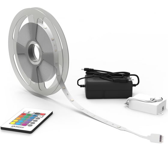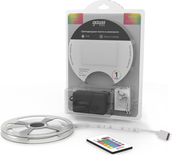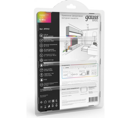 Лента Gauss Basic в комплекте 12V 6W/m 390lm/m RGB IP20 LED 5m BT012 способна решить ряд задач связанных как с декоративным освещением помещений, так и с экстерьерной подсветкой.