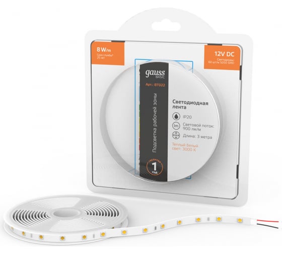 Технические характеристики Gauss Basic 12V 8W/m 900lm/m 3000K IP20 LED 3m BT022