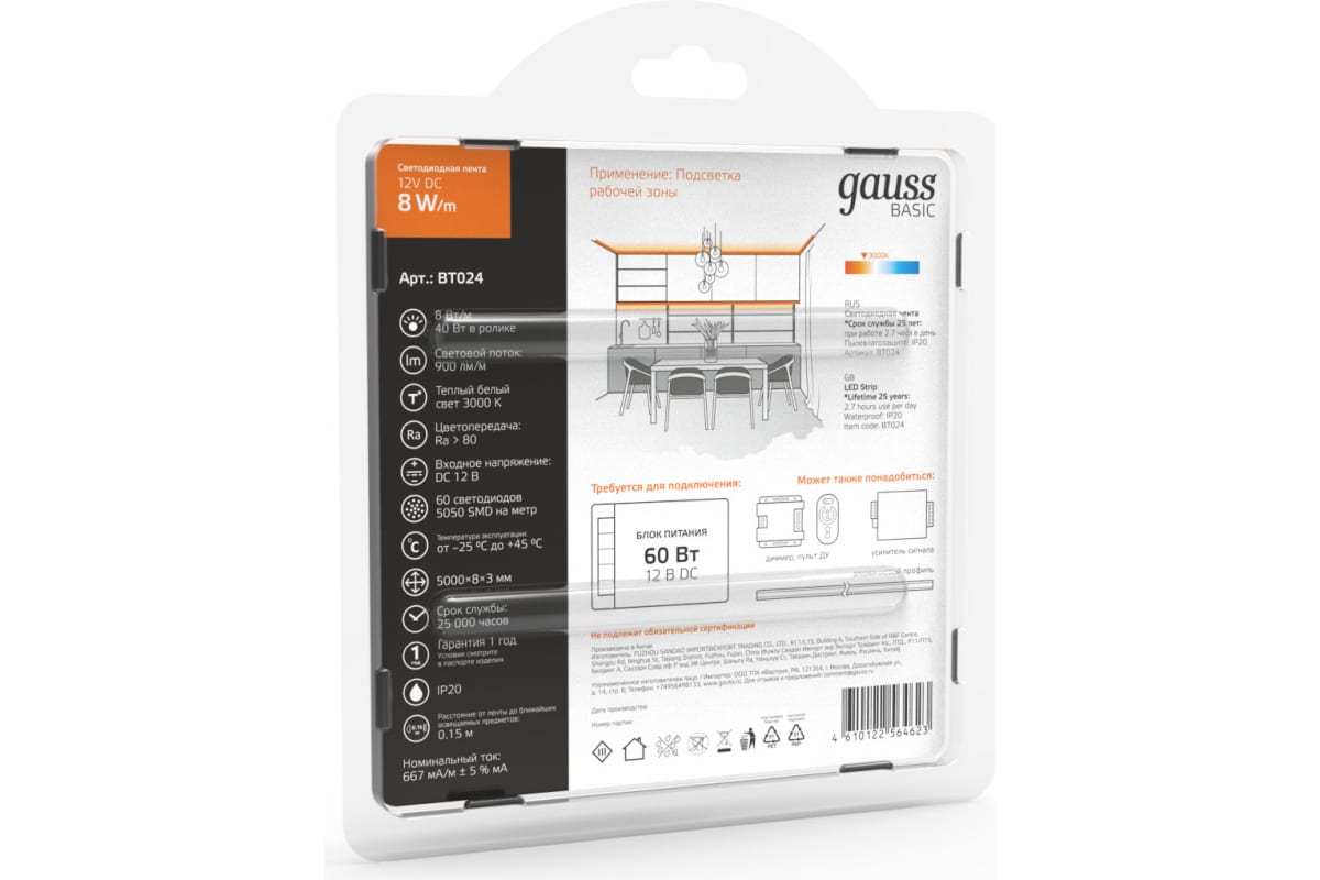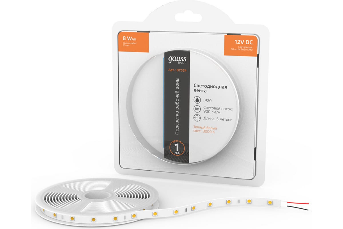 Лента Gauss Basic 12V 8W/m 900lm/m 3000K IP20 LED 5m BT024 способна решить ряд задач связанных как с декоративным освещением помещений, так и с экстерьерной подсветкой.