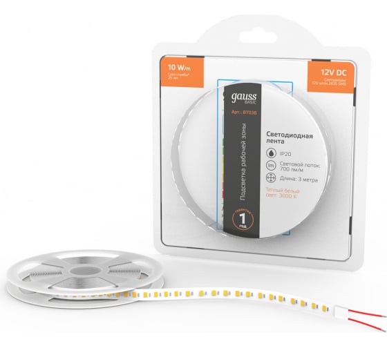 Лента Gauss Basic 12V 10W/m 700lm/m 3000K IP20 LED 3m BT036 способна решить ряд задач связанных как с декоративным освещением помещений, так и с экстерьерной подсветкой.