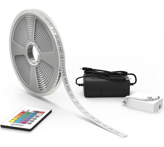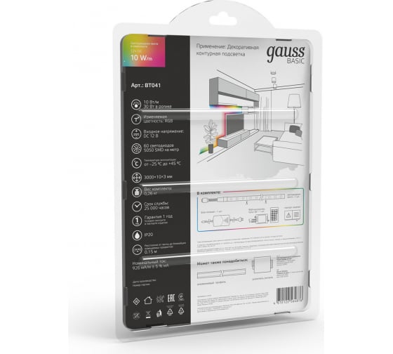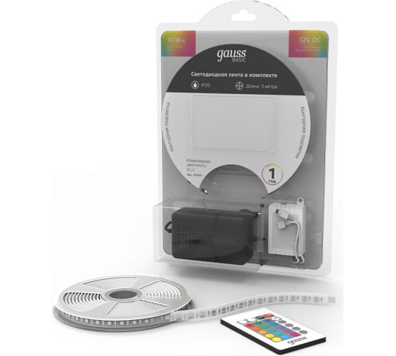 Лента Gauss Basic в комплекте 12V 10W/m 700lm/m RGB IP20 LED 3m BT041 способна решить ряд задач связанных как с декоративным освещением помещений, так и с экстерьерной подсветкой.
