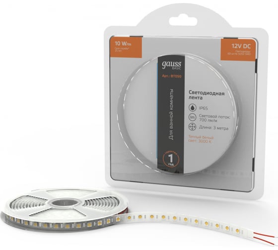 Технические характеристики Gauss Basic 12V 10W/m 700lm/m 3000K IP65 LED 3m BT050