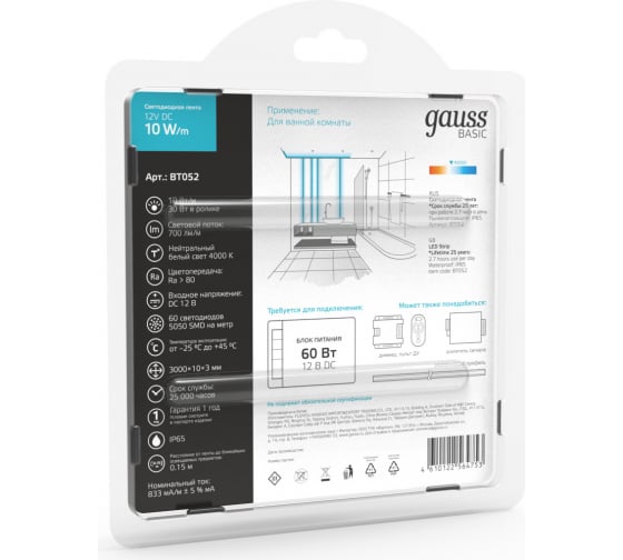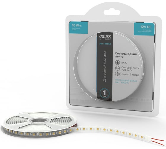 Технические характеристики Gauss Basic 12V 10W/m 700lm/m 4000K IP65 LED 3m BT052