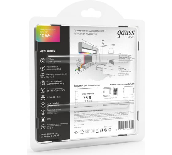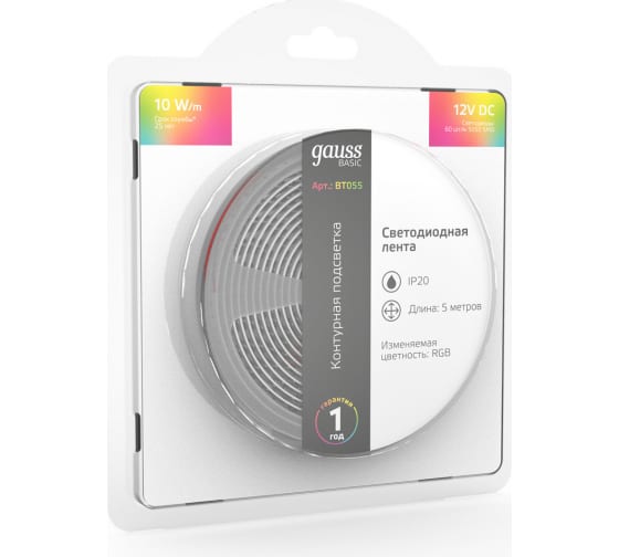 Лента Gauss Basic 12V 10W/m 700lm/m RGB IP20 LED 5m BT055 способна решить ряд задач связанных как с декоративным освещением помещений, так и с экстерьерной подсветкой.