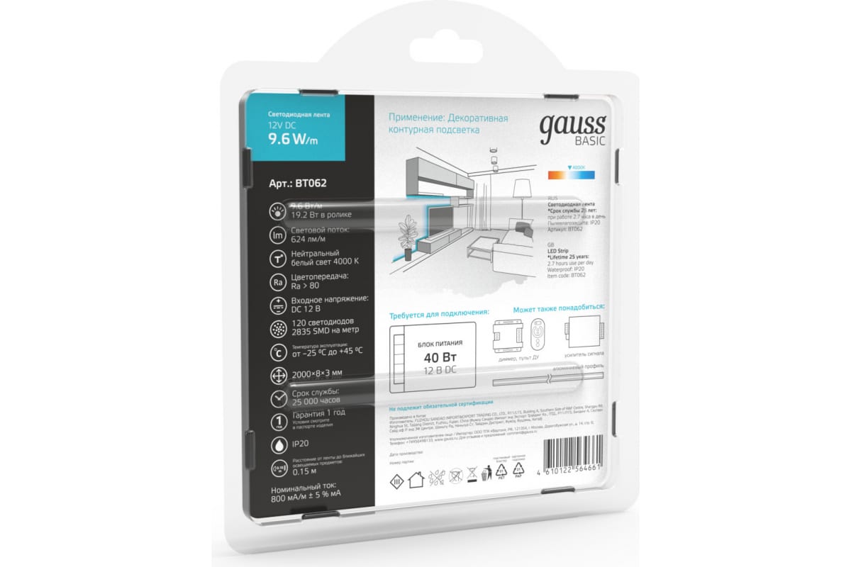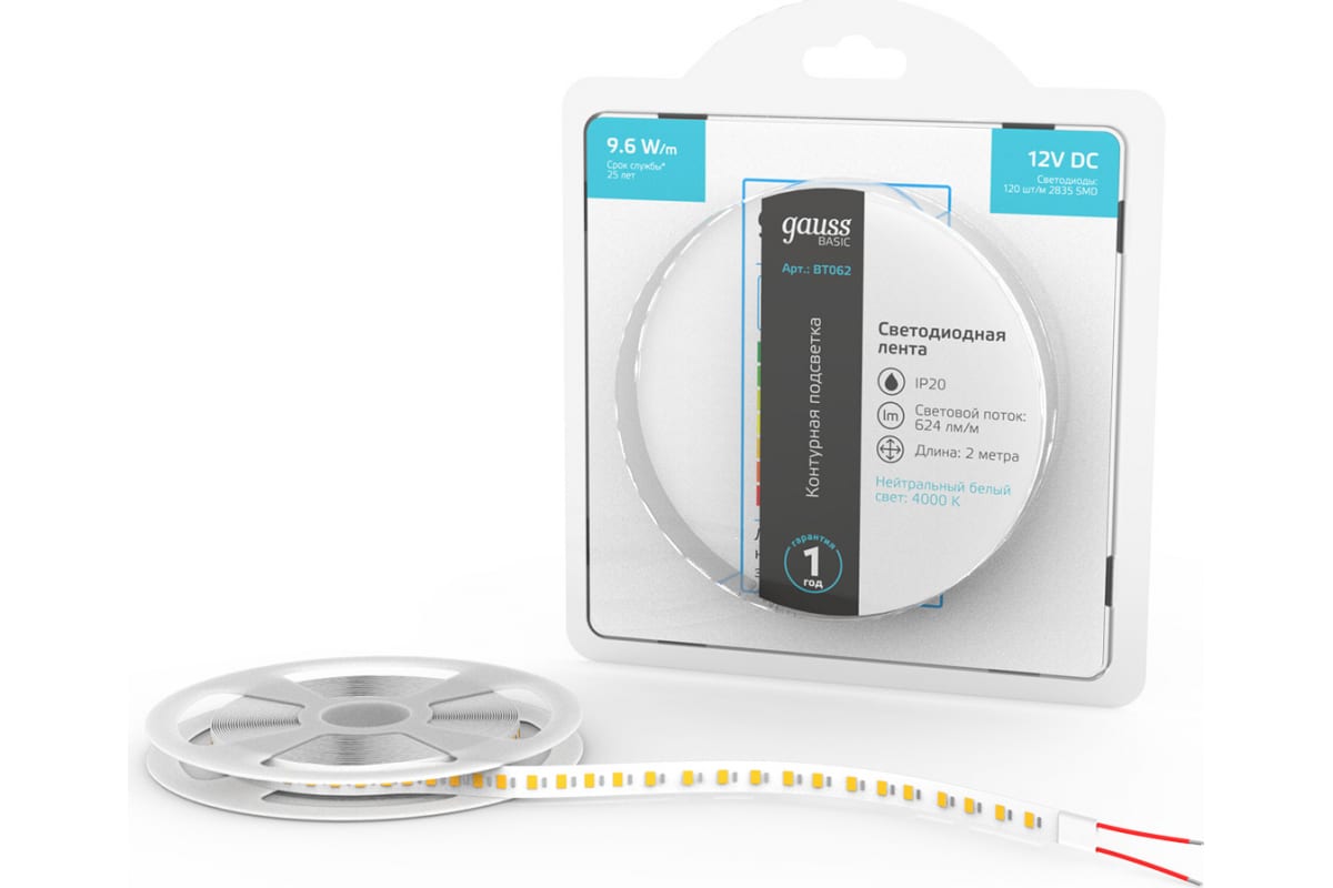 Лента Gauss Basic 12V 9,6W/m 624lm/m 4000K IP20 LED 2m BT062 способна решить ряд задач связанных как с декоративным освещением помещений, так и с экстерьерной подсветкой.