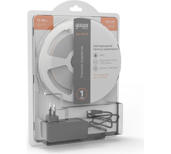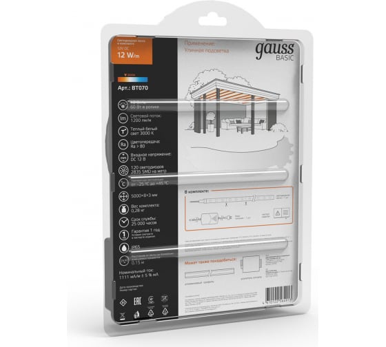 Технические характеристики Gauss Basic в комплекте 12V 12W/m 1200lm/m 3000K IP65 LED 5m BT070