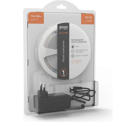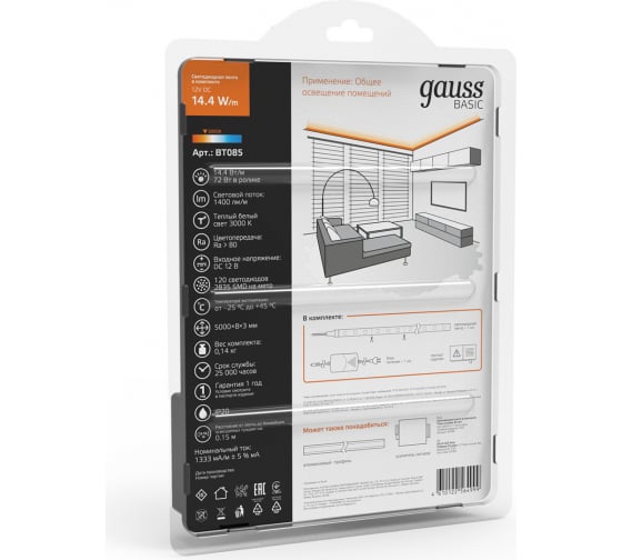 Технические характеристики Gauss Basic в комплекте 12V 14,4W/m 1400lm/m 3000K IP20 LED 5m BT085