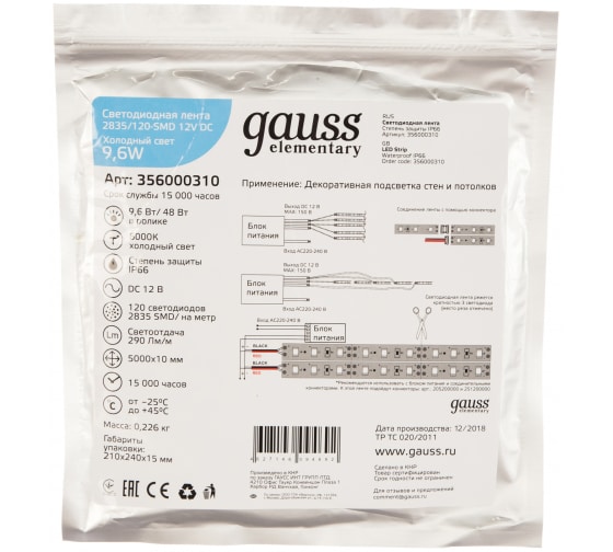 Технические характеристики Gauss LED Elementary 2835 120-SMD 9,6 Вт 12 В DC 5 м 356000310