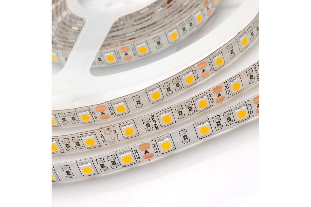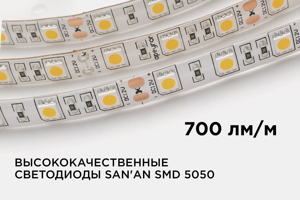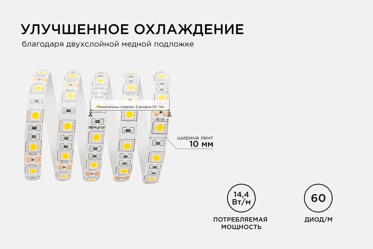 Светодиодная лента из линейки Apeyron Electrics 00-144 работает от постоянного тока с напряжением 12 В. Благодаря светодиодам smd 5050 излучающим световой поток равный 700 лм/м лента является прекрасным решением для организации основного освещения и ярких декоративных подсветок. Она подойдет для создания основного освещения на базе многоуровневых потолков, а также будет отличным выбором для освещения торгового оборудования или требующих большой яркости рекламных вывесок. По сравнению с лампами накаливания светодиодная лента эквивалентна лампам мощностью 70 Вт.