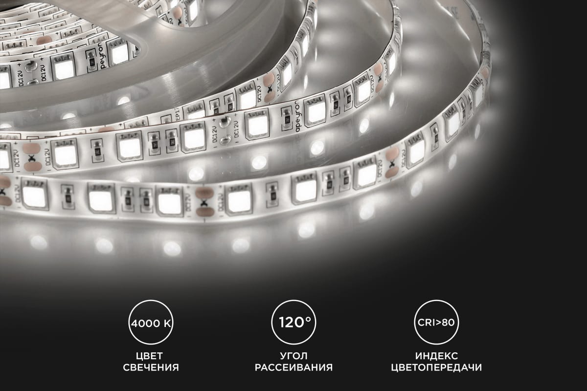 Светодиодная лента белая обладает дневным белым цветом свечения с цветовой температурой 4000 К. При выборе светодиодной ленты важно учитывать такой параметр, как потребляемая мощность, чтобы правильно подобрать блок питания. У данной модели этот показатель равен 14,4 Вт на один метр. Степень защиты этого изделия соответствует стандарту IP65, что позволяет использование не только во влажных помещениях, но и на улице. Отрезать светодиодную ленту можно в специально отмеченных местах, которые располагаются через каждые 50 мм. Компактные размеры светодиодной ленты с шириной 10 мм и основанием из гибкой, двухслойной, медной подложки дают огромное преимущество при создании любых дизайнерских фантазий.