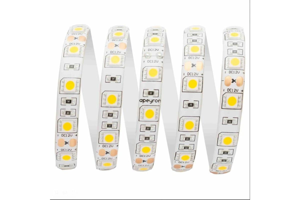 Светодиодная лента Apeyron 12В, СТ, 14,4Вт/м, smd5050, 60д/м, IP65, 700Лм/м 00-527 работает от постоянного тока с напряжением 12В. Лента является прекрасным решением для организации основного освещения и ярких декоративных подсветок. Она подойдет для создания основного освещения на базе многоуровневых потолков, а также будет отличным выбором для освещения торгового оборудования или требующих большой яркости рекламных вывесок. По сравнению с лампами накаливания светодиодная лента эквивалентна лампам мощностью 70 Вт.