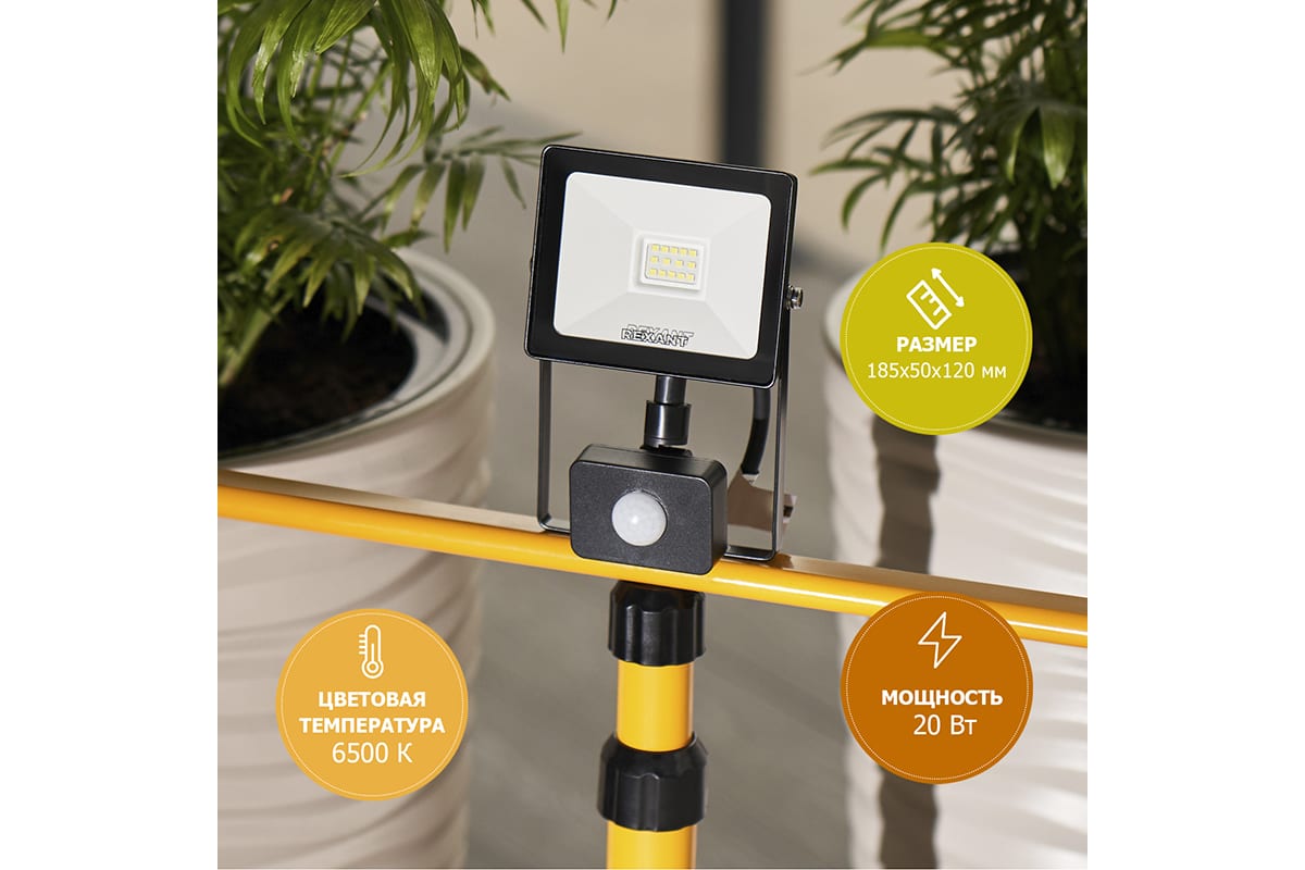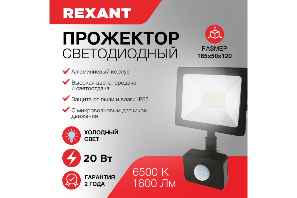 Технические характеристики REXANT с датчиком движения 20Вт 200–260В IP44 1600лм 6500K холодный свет 605-008
