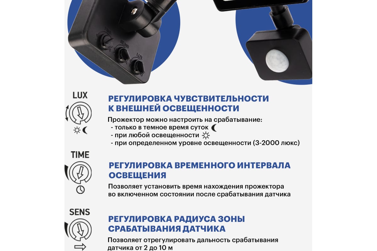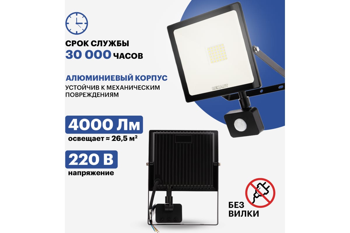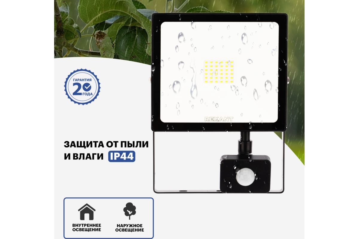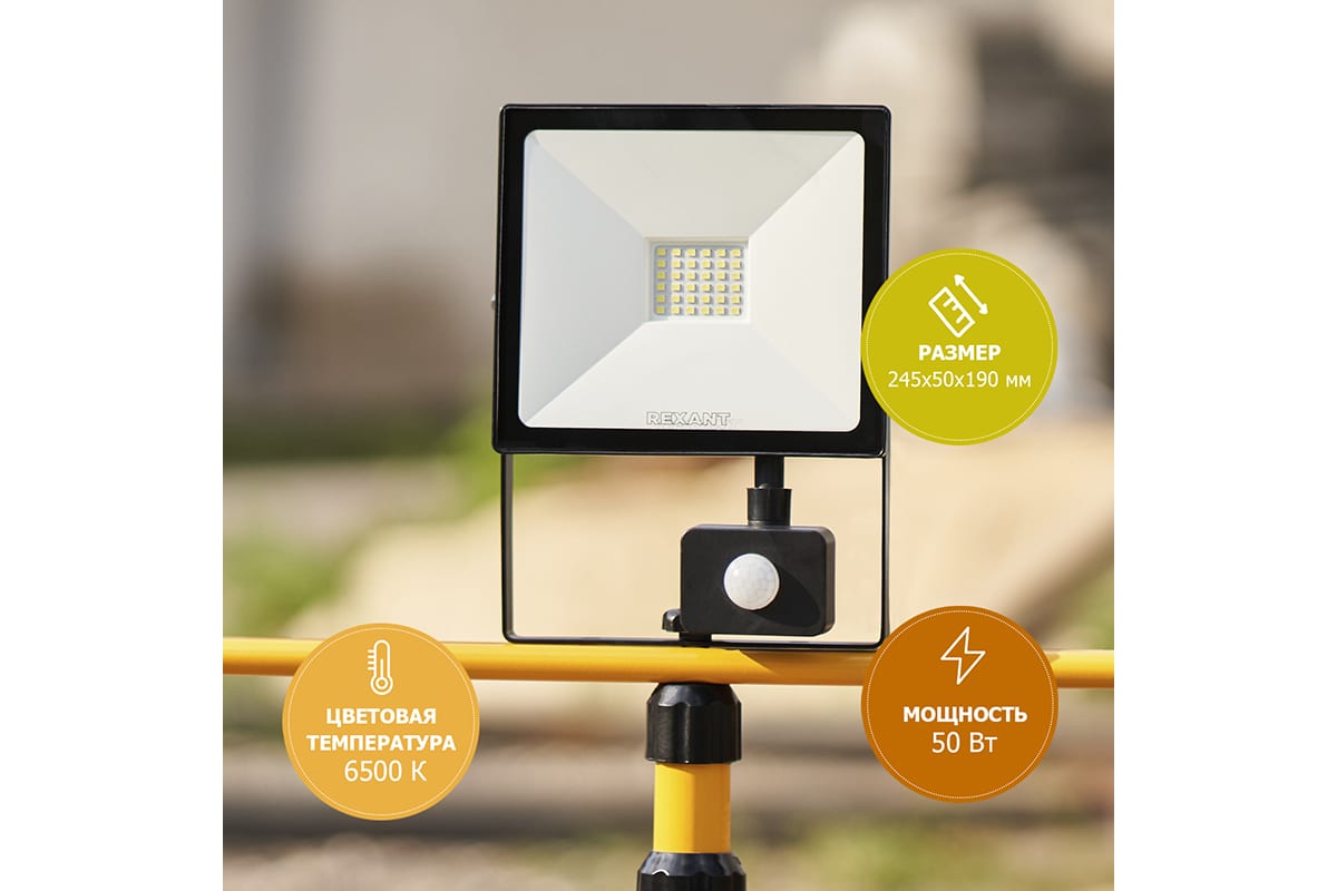 Технические характеристики REXANT с датчиком движения 50Вт 200–260В IP44 4000лм 6500K холодный свет 605-009
