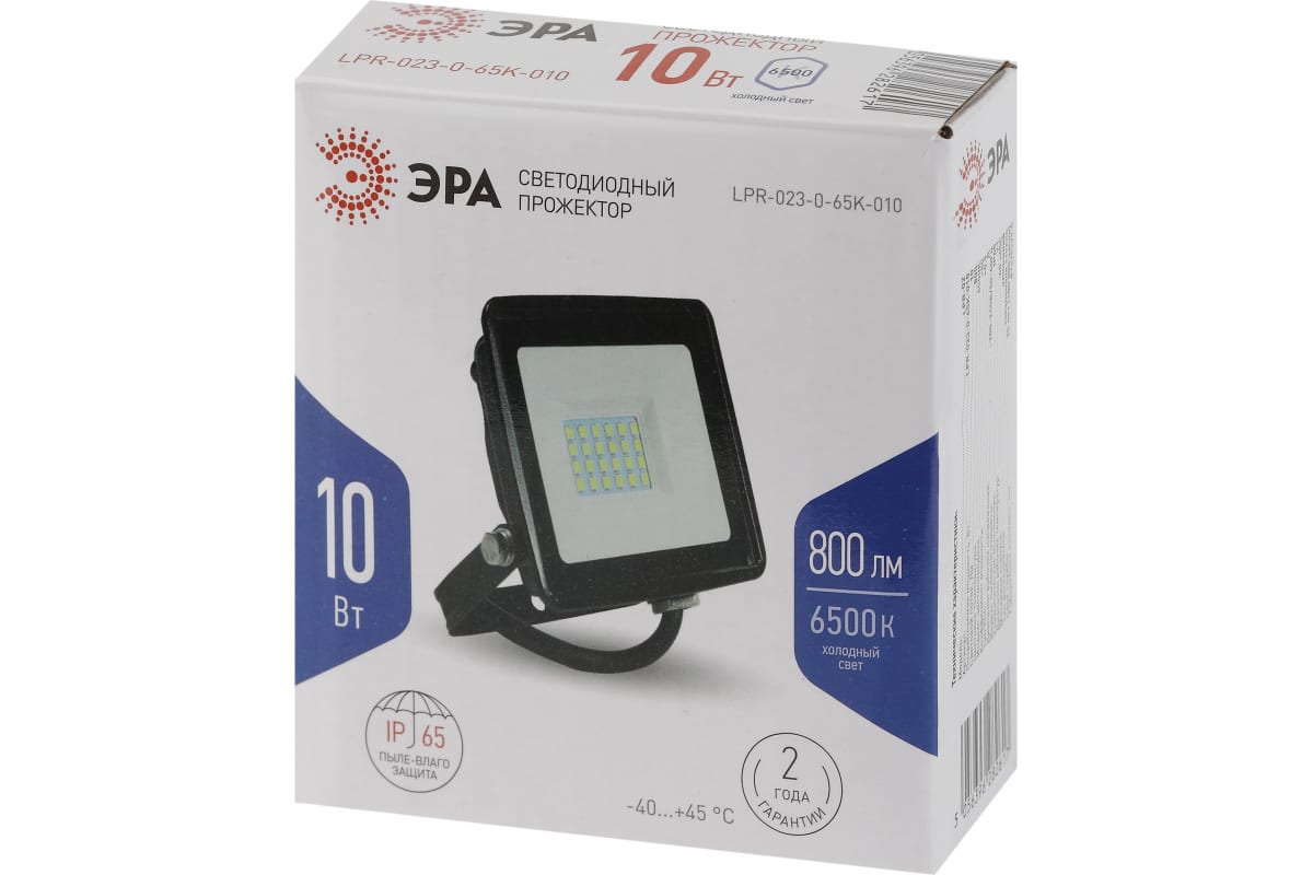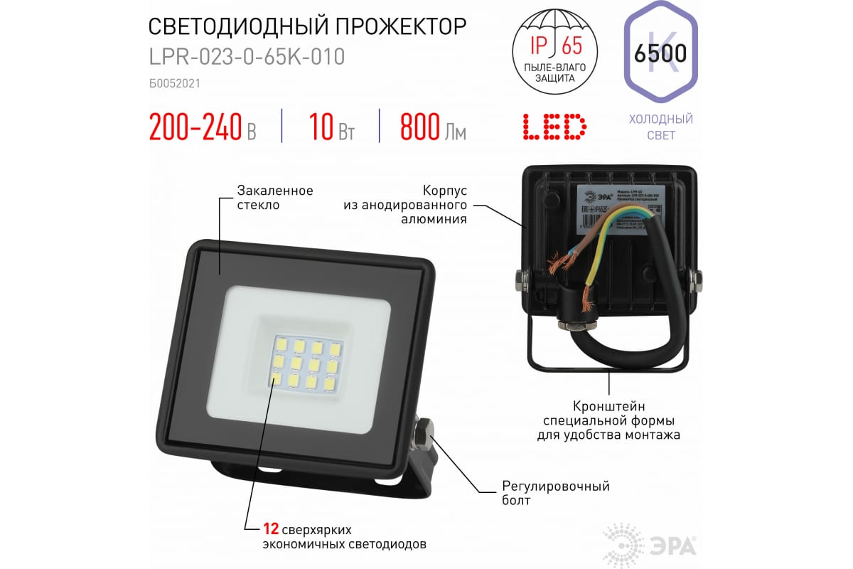 1.Светодиодный уличный прожектор ЭРА LPR023065K010 10Вт 6500K 800Лм 81х75х21,5 Б0052021 отличается простой и быстрой установкой: есть кронштейн специальной формы и регулировочные болты для выбора направления света.