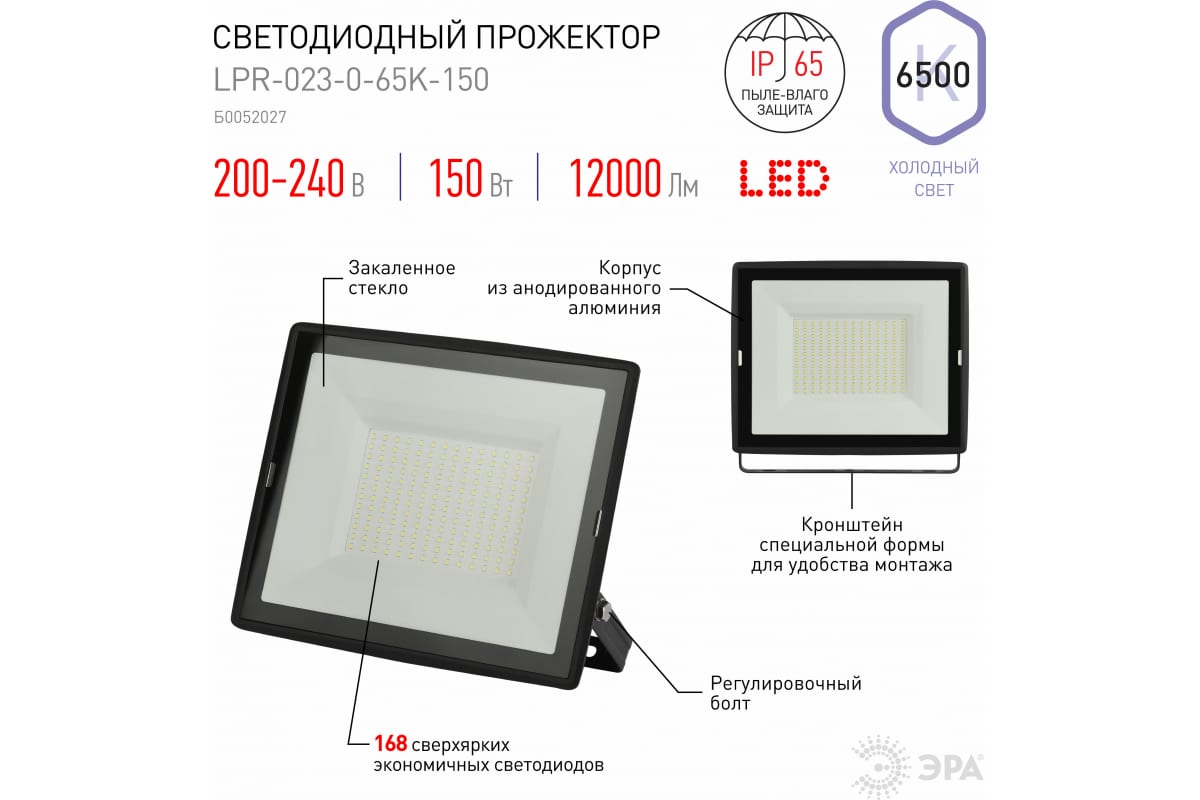 1.Светодиодный уличный прожектор ЭРА LPR-023-0-65K-150 150Вт 6500K 12000Лм 280х253х41 Б0052027 отличается простой и быстрой установкой: есть кронштейн специальной формы и регулировочные болты для выбора направления света.