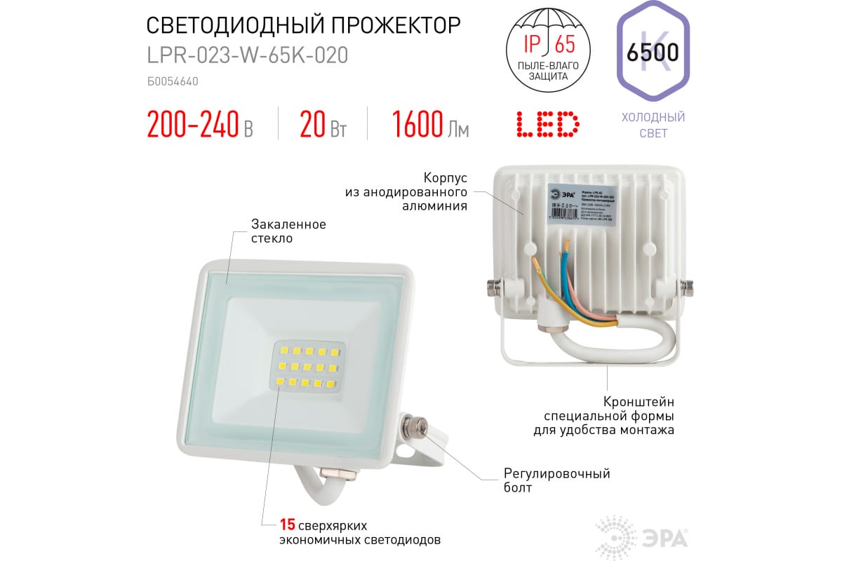 Технические характеристики ЭРА LPR-023-W-65K-020 20Вт 6500K 1600Лм белый Б0054640