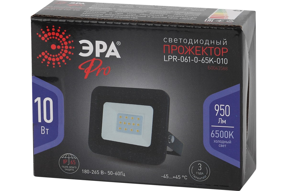 Светодиодный прожектор ЭРА LPR061065K010 10Вт 950Лм 6500К 100x80x26 Б0043588 защищен от пыли и струй воды с любого направления. Корпус изготовлен из анодированного алюминия с покраской в черный цвет. Стекло - закаленное. LED технология обеспечивает длительный срок службы и экономию электроэнергии.