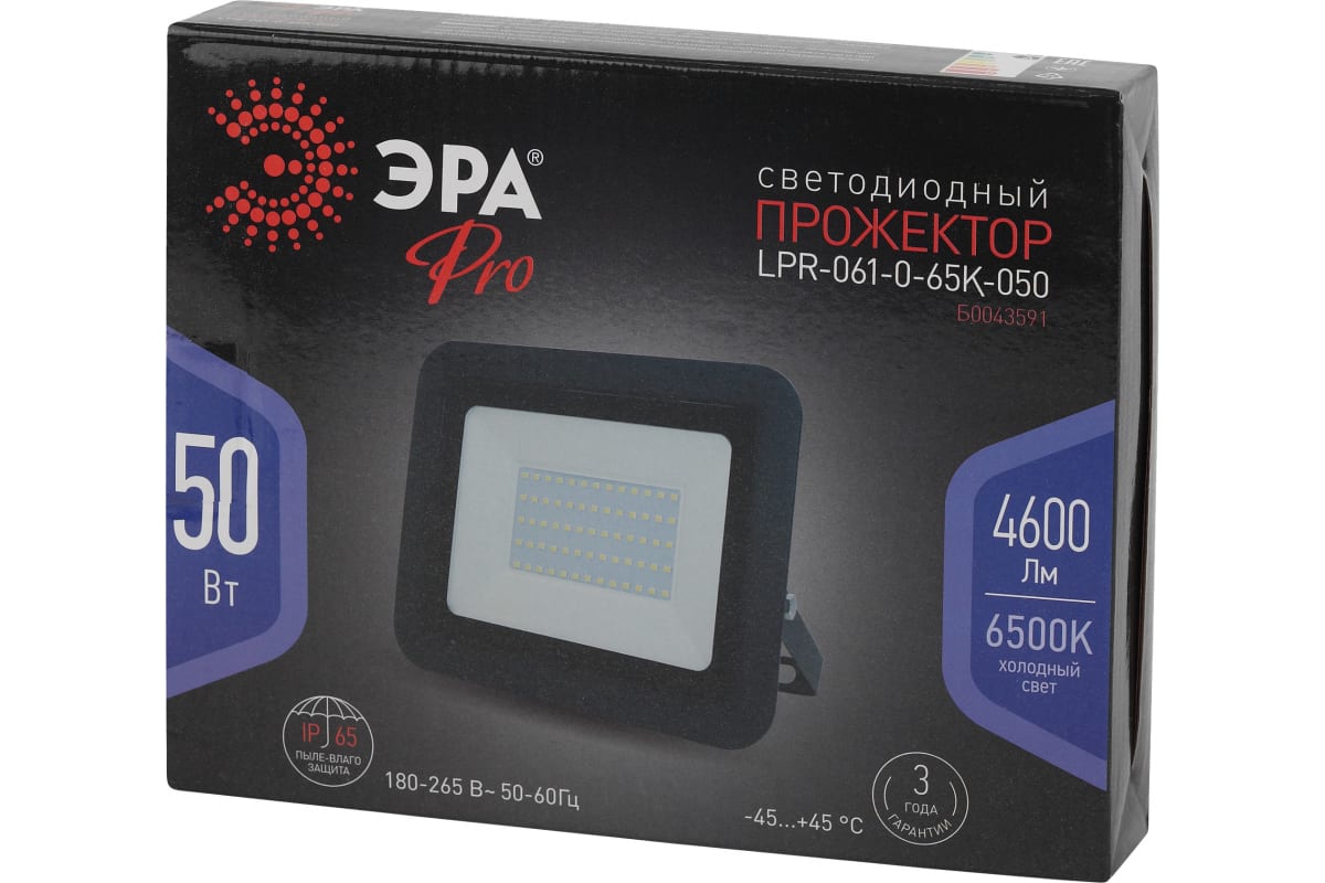 Светодиодный прожектор ЭРА LPR061065K050 205x165x33 50Вт 4600Лм 6500К Б0043591 защищен от пыли и струй воды с любого направления. Корпус изготовлен из анодированного алюминия с покраской в черный цвет. Стекло - закаленное. LED технология обеспечивает длительный срок службы и экономию электроэнергии.