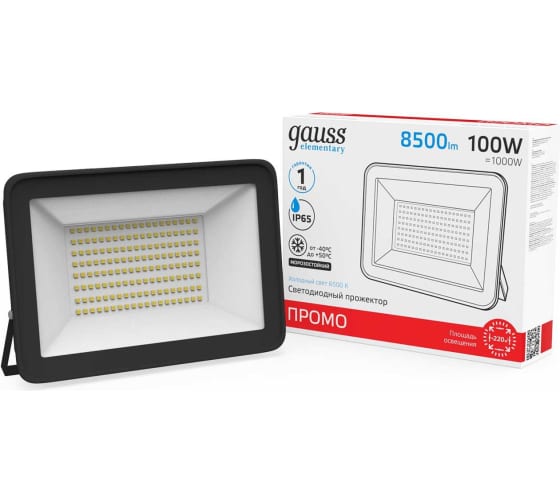 Светодиодный прожектор Gauss Elementary 100W 8500lm IP65 6500К ПРОМО G2 черный 613100100P создан для экстерьерной общей подсветки зданий и сооружений, освещения складов, промышленных и торговых объектов, а также ландшафтных объектов, теперь имеет улучшенную модификацию корпуса. Корпус прожектора Elementary изготовлен из прочного литого алюминия, рассеиватель выполнен из прозрачного закаленного стекла. Экономичная LED технология сокращает до 90% затрат на электроэнергию. Использование надежного нелинейного интегрированного драйвера гарантирует работу практически в любых условиях, отсутствие электромагнитных помех и высокий коэффициент мощности более 0,9. Материалы изготовления и конструкция прожекторов Elementary обеспечивают их высокую механическую прочность и полную защиту от пыли и влаги по классу IP65.