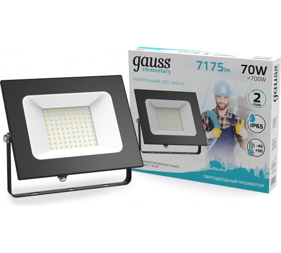 Светодиодный светильник Gauss Elementary, 70W, 7175lm, IP65, 4000К, черный, 1/10 613100270 прожектор Gauss Elementary созданный для экстерьерной общей подсветки зданий и сооружений, освещения складов, промышленных и торговых объектов, а также ландшафтных объектов, теперь имеет улучшенную модификацию корпуса.