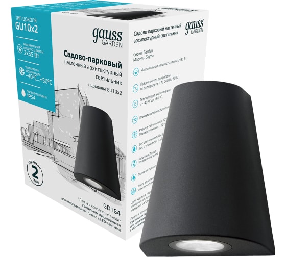 Настенный садово-парковый светильник Gauss Sigma архитектурный, 2xGU10, 125х88х156mm GD164 имеет современный стильный дизайн.