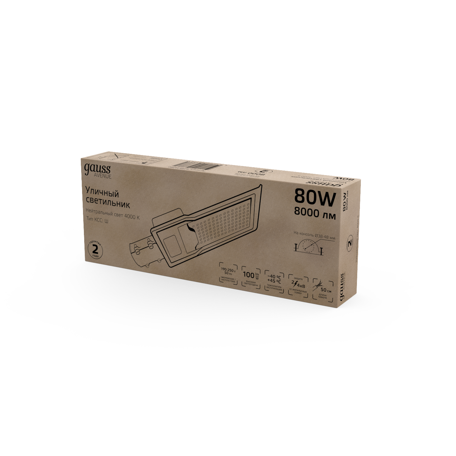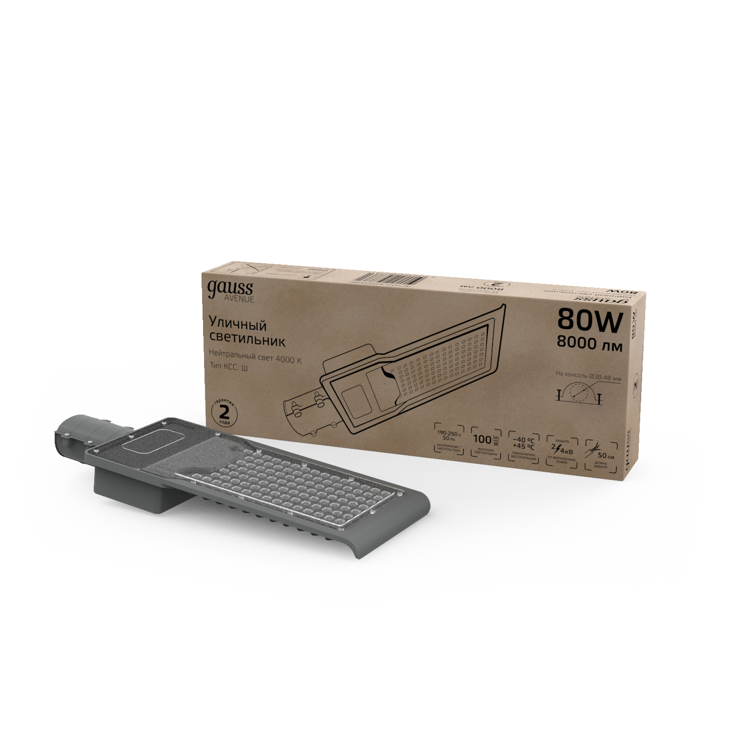Светильник уличный Gauss LED Avenue 80W это консольный LED светильник, корпус которого изготовлен из анодированного алюминия и прозрачного пластикового рассеивателя. У него высокий уровень пылевлагозащиты IP 65 и защиты от импульсных помех. Светильник легко монтируется на консоль. Работает в большом диапазоне температур от -40 до +45°С и имеет холодный белый свет 4000К, который дает максимальное освещение необходимой территории. Светильник не боится грозы, может использоваться для освещения улиц, участков дорог, придомовых территорий, парковых аллей.